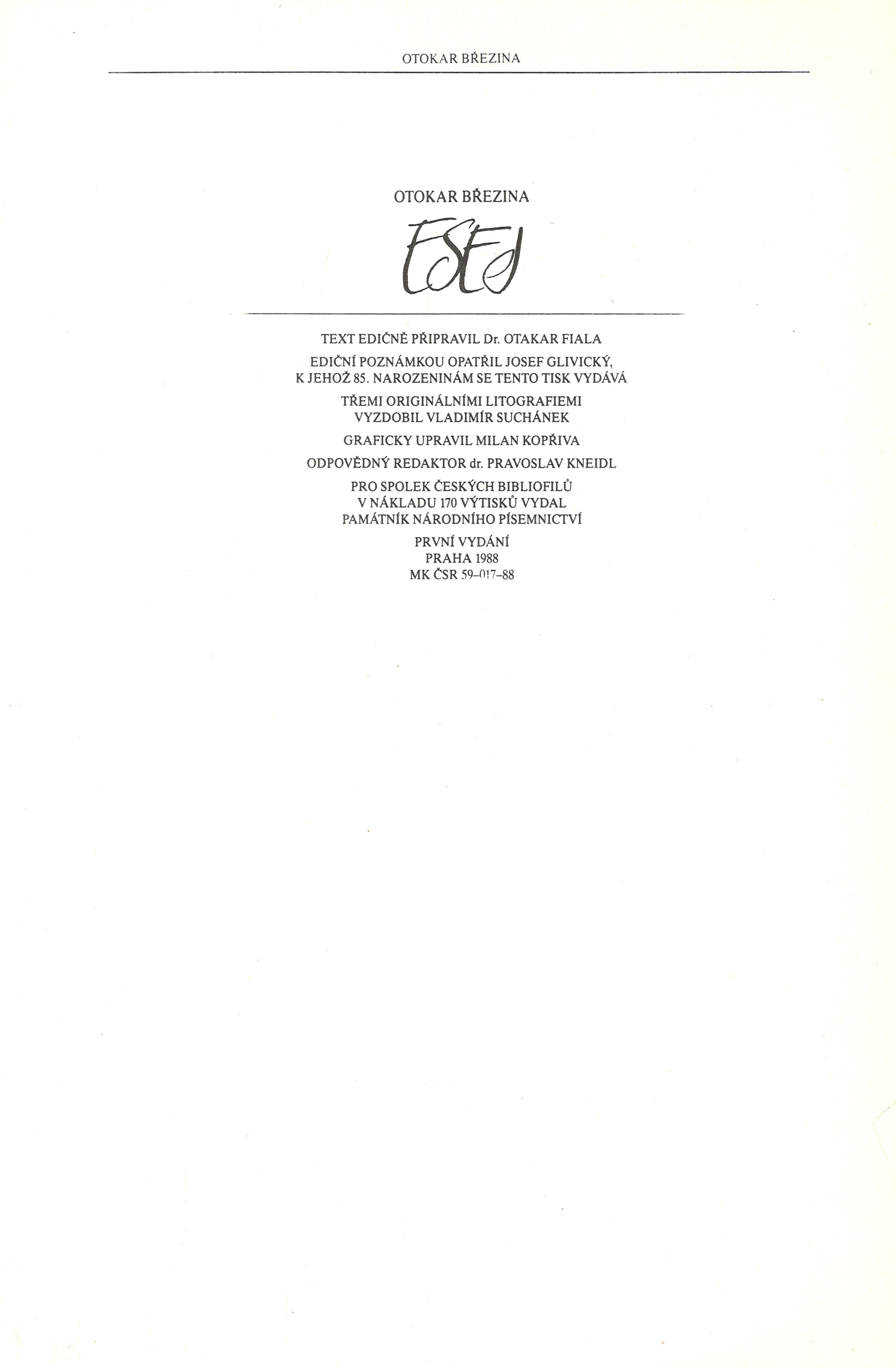 Názvové údaje Esej / Otokar Březina ; text edičně připravil Otakar Fiala ; ediční poznámkou opatřil Josef Glivický ... ; třemi originálními litografiemi vyzdobil Vladimír Suchánek ; graficky upravil Milan Kopřiva Osobní jméno Březina, Otokar, 1868-1929 (Autor) Další autoři Fiala, Otakar, 1889-1977 (Editor) Glivický, Josef, 1903-1991 (Autor komentáře) Suchánek, Vladimír, 1933-2021 (Ilustrátor) Kopřiva, Milan, 1929-1997 (Knižní grafik) Korp. Spolek českých bibliofilů v Praze (Nakladatel, vydavatel) Památník národního písemnictví (muzeum literatury) (Nakladatel, vydavatel) Údaje o vydání První vydání Nakladatel Praha : Spolek českých bibliofilů, 1988 Rozsah 8 nečíslovaných stran : barevné ilustrace ; 32,5 cm ISBN (Volné dvojlisty) Země vyd. Česko Jazyk dok. čeština Poznámky Barevná typografická obálka. - Barevné ilustrace. - Ediční poznámka. - 170 výtisků. - Volné dvojlisty v papírové obálce. - Bibliofilie.