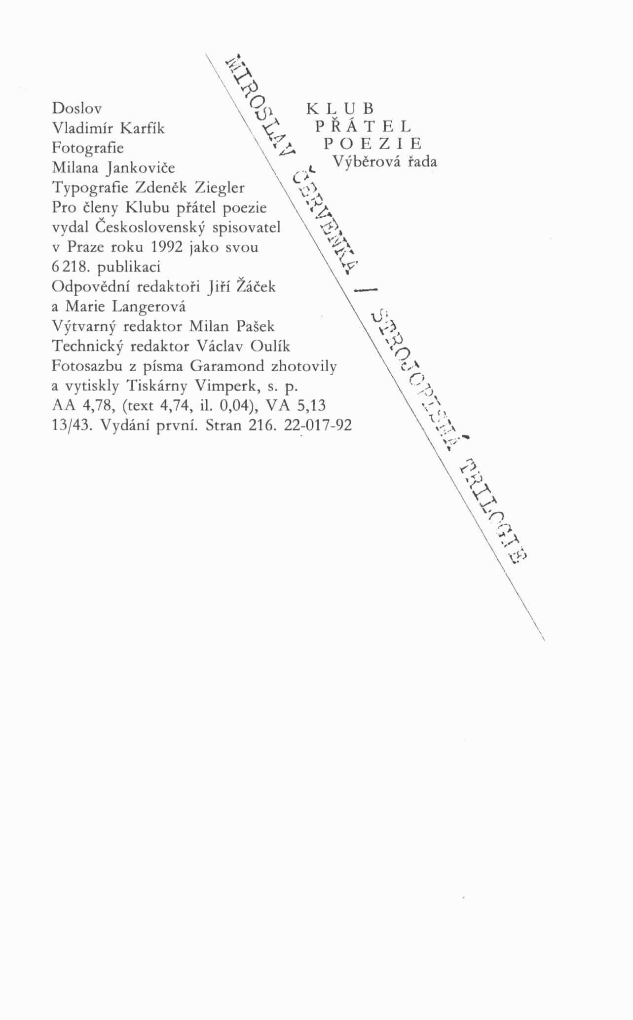 Klub přátel poezie. Výběrová řada (Československý spisovatel)Země vyd. Česko Jazyk dok. čeština Poznámky Na záložce přebalu poznámka o autorovi. - Čb. fotografie. - Doslov. - Obsah.