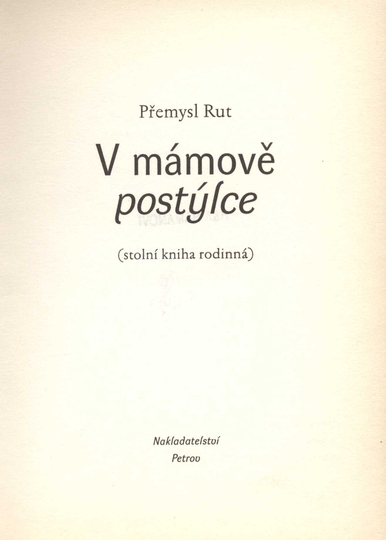 Názvové údaje V mámově postýlce : stolní kniha rodinná / Přemysl Rut ; [typografie Otakar Karlas ; fotografie na záložce Nina Rutová] Osobní jméno Rut, Přemysl, 1954- (Autor) Další autoři Karlas, Otakar, 1956- (Typograf) Rutová, Nina (Fotograf) Korp. Nakladatelství Petrov (Nakladatel, vydavatel) Tiskárna Reprocentrum (Tiskař) Údaje o vydání Vyd. 1. Nakladatel Brno : Petrov, 2000 Výrobce Reprocentrum) Rozsah 206 s. ISBN 80-7227-083-4 (váz.) Země vyd. Česko Jazyk dok. čeština Poznámky Na záložkách obálky poznámky o knize a autorovi s fotem. - Předmluva. - Doslov. - Ediční poznámka. - Zdobená obálka.