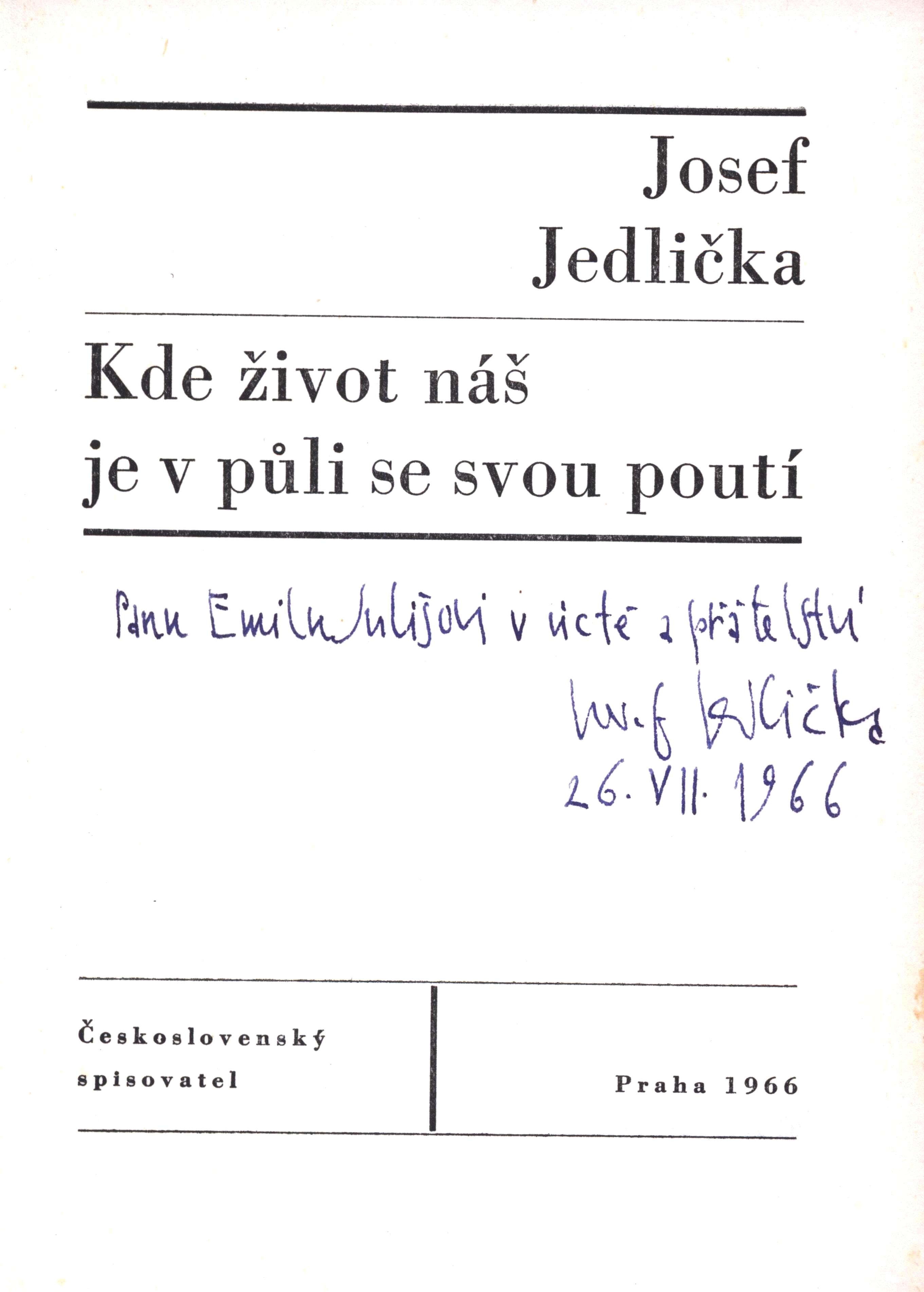 Názvové údaje Kde život náš je v půli se svou poutí / Josef Jedlička ; [obálku, vazbu a typografickou úpravu navrhl Zdenek Seydl] Osobní jméno Jedlička, Josef, 1927-1990 (Autor) Další autoři Seydl, Zdenek, 1916-1978 (Autor obálky) (Výtvarník vazby) (Typograf) Údaje o vydání 1. vyd Nakladatel Praha : Československý spisovatel, 1966 Rozsah 114 s. ISBN (váz.) Edice Život kolem nás. Malá řada sv. 22