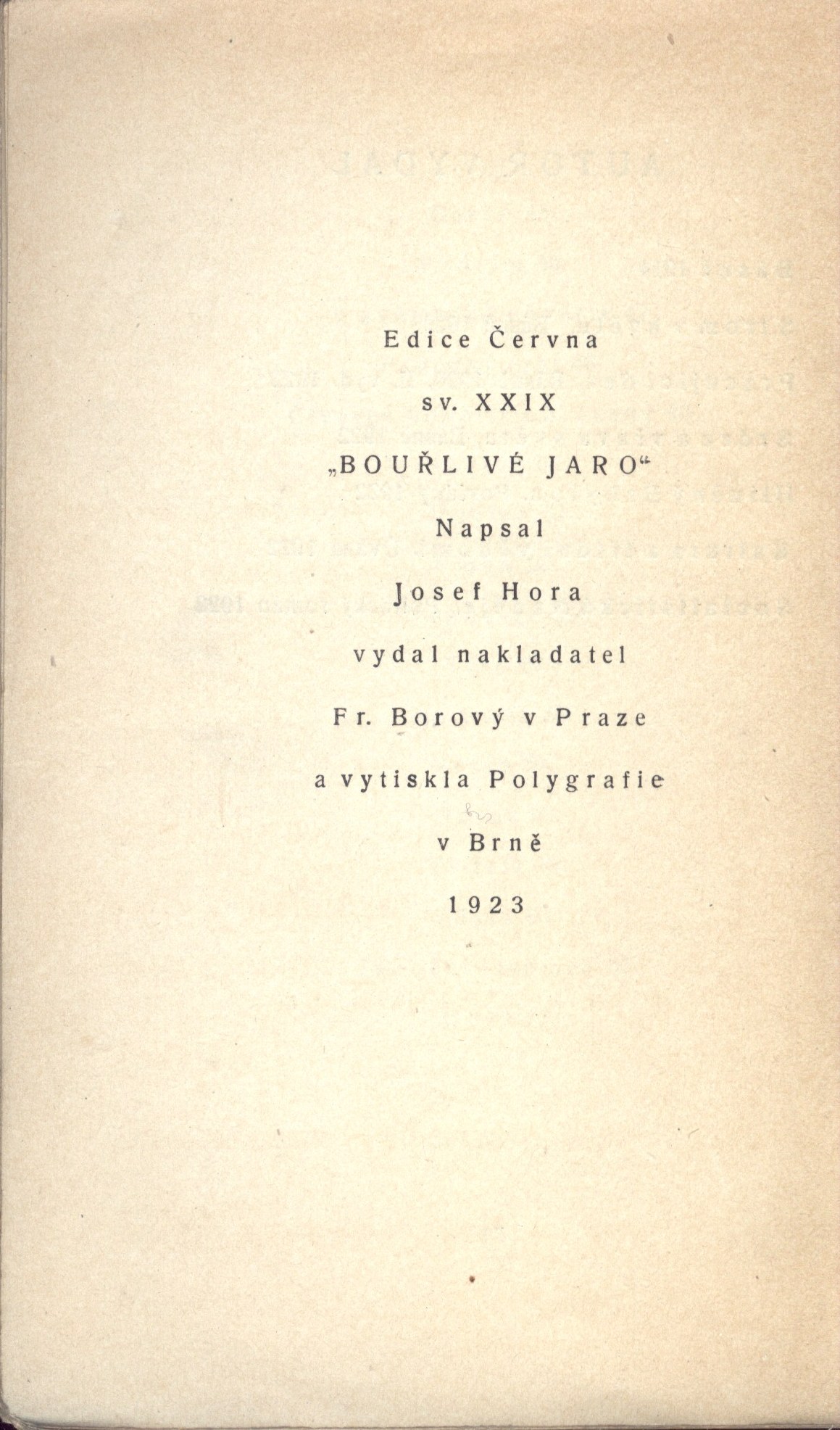Názvové údaje Bouřlivé jaro : pátá kniha básní / Josef Hora Osobní jméno Hora, Josef, 1891-1945 (Autor) Další autoři Šimsová, Růžena, 1899- (Dřívější majitel) (Autor podpisu) Korp. Fr. Borový (firma) (Nakladatel, vydavatel) Polygrafia (nakladatelství a tiskárna, Brno) (Tiskař) Další var.názvy Pátá kniha básní Nakladatel V Praze : nakladatel Fr. Borový, 1923 Výrobce V Brně : Polygrafie Rozsah 71 stran ; 17 cm ISBN (Brožováno) Edice Edice Června ; sv. XXIX