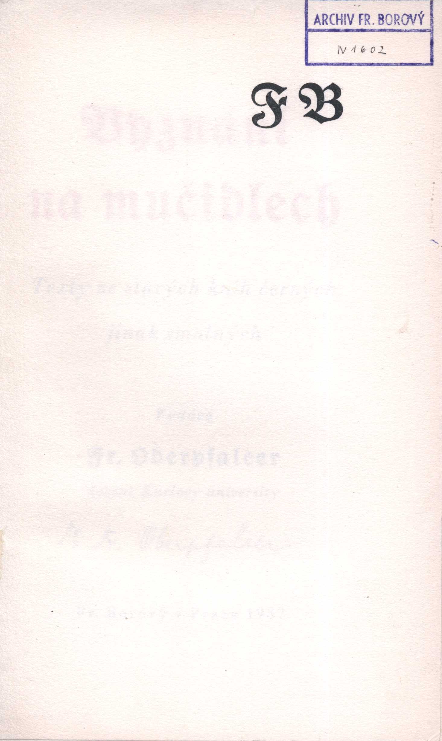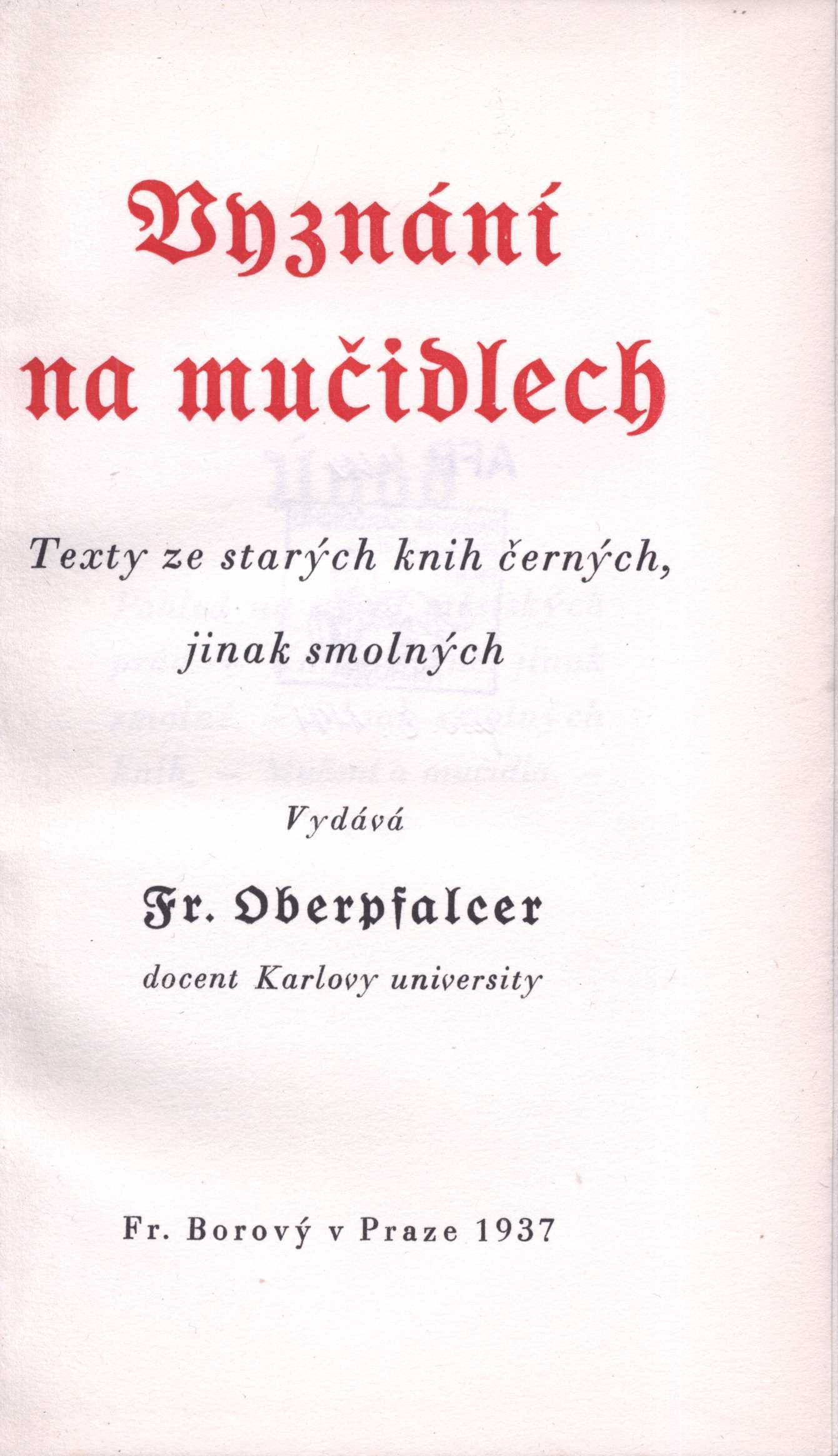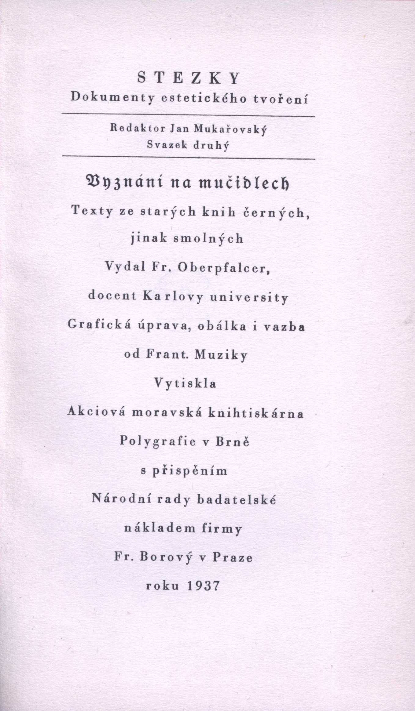 Názvové údaje Vyznání na mučidlech : texty ze starých knih černých, jinak smolných / vydává Fr. Oberpfalcer ; [grafická úprava, obálka i vazba od Frant. Muziky] Další autoři Oberpfalcer, František, 1890-1973 (Editor) Muzika, František, 1900-1974 (Knižní grafik) Korp. Fr. Borový (firma) (Nakladatel, vydavatel) Akciová moravská knihtiskárna Polygrafie (Tiskař) Údaje o vydání 1. vyd. Nakladatel Praha : Fr. Borový, 1937 Rozsah 357 s. : il. ISBN brož. Edice Stezky = dokumenty estetického tvoření sv. 2