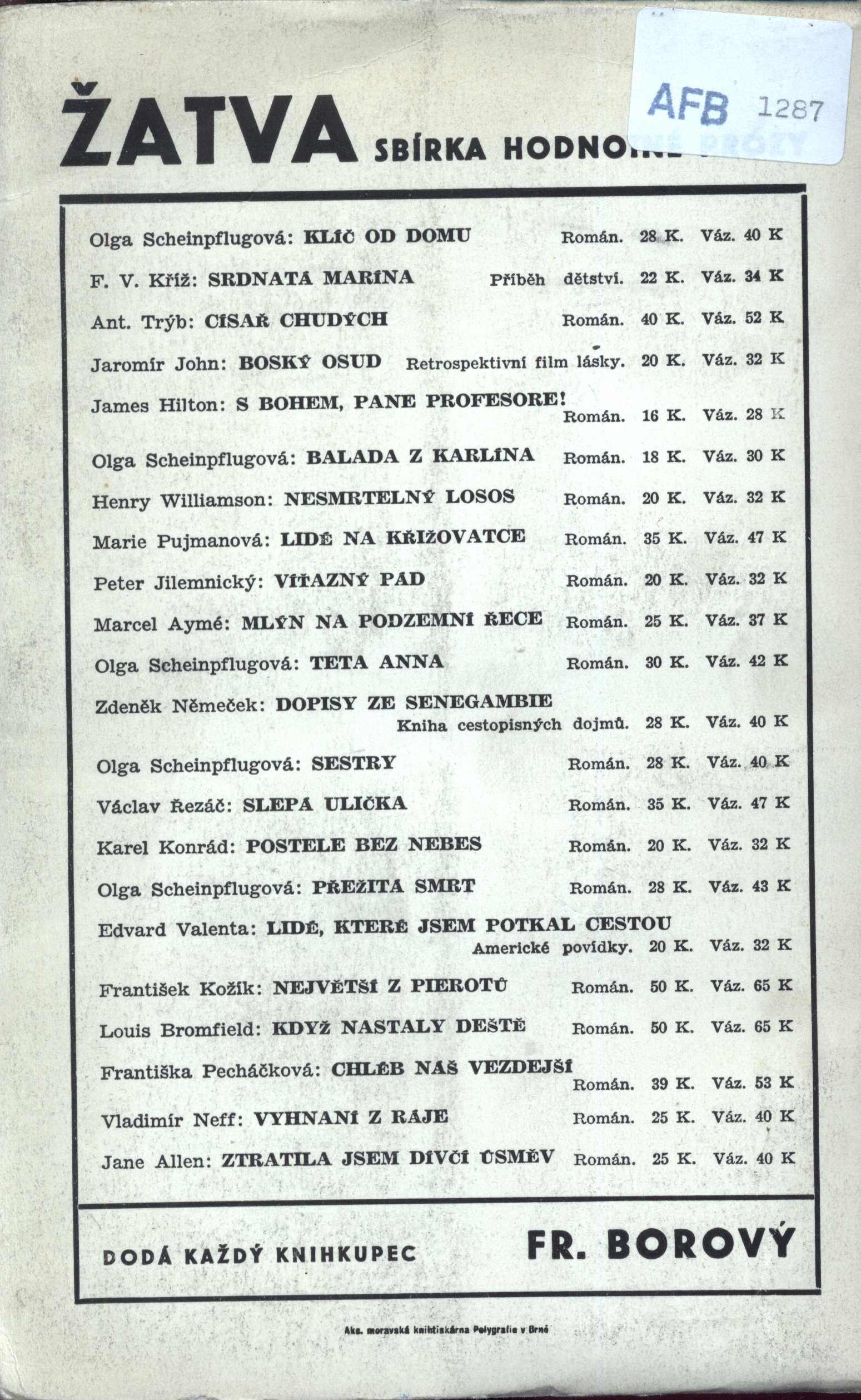 Žatva, sbírka hodnotné prosy, (Fr. Borový)Země vyd. -cs Jazyk dok. čeština Jazyk orig. angličtina Poznámky Zdobená obálka. - Na záložce poznámka o knize. - Značka edice. - Na zadní straně obálky nakladatelská upoutávka na vydané knihy v edici Žatva.