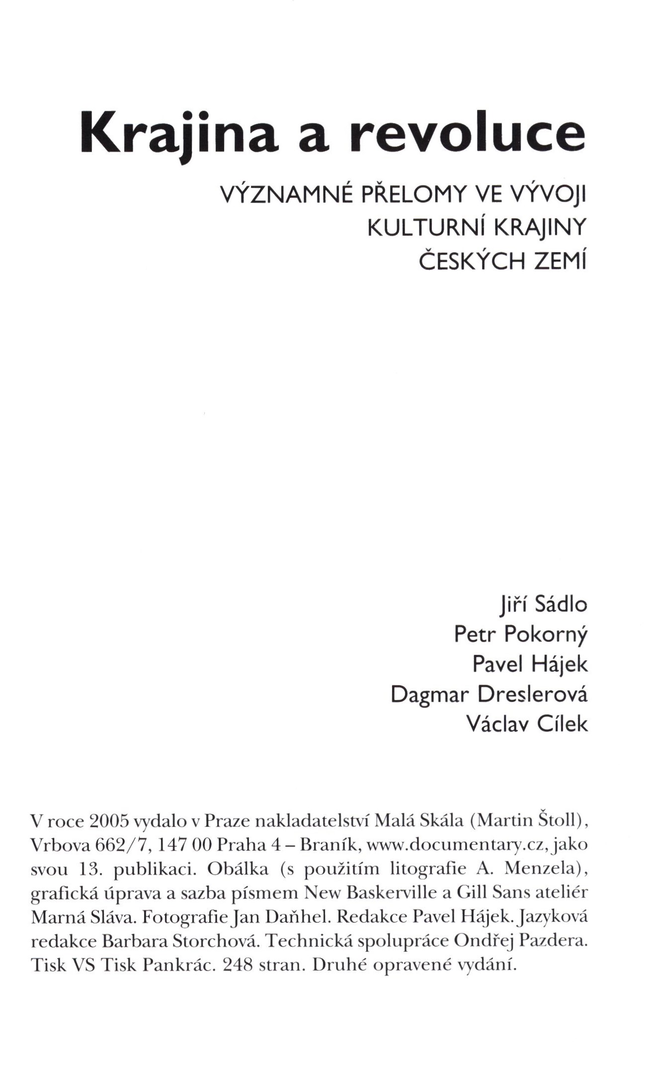 Názvové údaje Krajina a revoluce : významné přelomy ve vývoji kulturní krajiny českých zemí / Jiří Sádlo ... [et al.] ; obálka (s použitím litografie A. Menzela), grafická úprava a sazba písmem New Baskerville a Gill Sans ateliér MArná Sláva ; fotografie Jan Daňhel Záhlaví-korpor. Marná Sláva (grafický atelier) (Grafický technik) Další autoři Sádlo, Jiří, 1958- (Autor) Pokorný, Petr, 1972- (Autor) Hájek, Pavel, 1977- (Autor) Dreslerová, Dagmar, 1958- (Autor) Cílek, Václav, 1955- (Autor) Daňhel, Jan, 1971- (Fotograf) Menzel, Adolph von, 1815-1905 (Umělec) Korp. Nakladatelství Malá Skála (Nakladatel, vydavatel) VS tisk (tiskárna) (Tiskař) Další var.názvy Významné přelomy ve vývoji kulturní krajiny českých zemí Údaje o vydání Druhé opravené vydání Nakladatel Praha : Malá Skála, 2005 Výrobce VS Tisk Rozsah 247 stran : černobílé fotografie ; 19 cm ISBN 80-86776-02-6 (brožováno) Země vyd. Česko Jazyk dok. čeština Poznámky Hnědá obálka s reprodukcí litografie A. Menzela. - Na přední záložce pokračování reprodukované litografie a text. - Na vakátě nakladatelská značka. - Předmluva autorů. - Černobílé reprodukované fotografie. - Bibliografické odkazy. - Historický přehled holocénu. - Slovníček vybraných pojmů. - Literatura. - Ediční poznámka. - Na zadní záložce stručné údaje o autorech.
