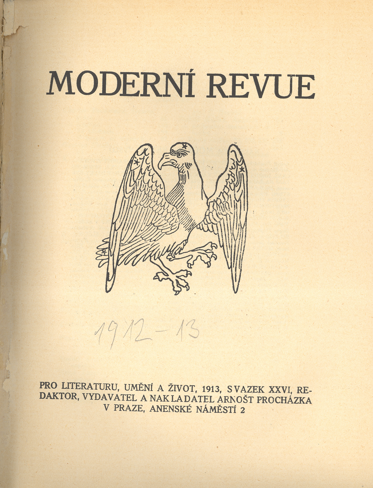 Názvové údaje Moderní revue : pro literaturu, umění a život Další autoři Procházka, Arnošt, 1869-1925 (Redaktor, výkonný redaktor) (Nakladatel, vydavatel) Karásek ze Lvovic, Jiří, 1871-1951 (Editor) Moreau, Gustave, 1826-1898 (Grafický technik) King, Jessie Marion, 1875-1949 (Grafický technik) Whistler, James McNeill, 1834-1903 (Grafický technik) Kobliha, František, 1877-1962 (Grafický technik) (Dřevorytec) Hodek, Josef, 1888-1973 (Grafický technik) (Dřevorytec) Bílek, František, 1872-1941 (Grafický technik) (Dřevorytec) Korp. J. Skalák a spol. (Praha) (Tiskař) Roč., číslo Ročník 19, svazek 26 a 27, číslo 1-12, 1912/1913 Nakladatel V Praze : Arnošt Procházka, 1912-1913 Tiskem J. Skaláka a spol. ISSN 1212-5962 Země vyd. Česko Jazyk dok. čeština Poznámky Dřevořezy a filigrány (grafiky na obálkách, vlysy a koncovky ve všech číslech) převzaté z benátských pramenů přelomu 15. a 16. století. - Obálky různých barev, vždy se stejnou grafikou. - Ročník obsahuje 11 příloh na nečíslovaných listech (zahrnutých do stránkování), z toho 1 reprodukovaný obraz Gustava Moreaua "Oidipos a sfinga" (sv. 26, před s. 3); 1 reprodukovaný obraz Jessie Marion Kingov: "Péleas a Melisanda" (sv. 26, před s. 101); 1 reprodukovaná kresba Jamese Mc Neilla Whistlera "Benátky (Tichý průplav)" (sv. 26, před s. 197); 2 dřevoryty Františka Koblihy "Ex Libris F. Karásek (sv. 27, před s. 3) a "Ex Libris V.Z." (sv. 27, před s. 19); 2 dřevoryty Josefa Hodka "Zuzana v lázni" (sv. 27, před s. 99 a před s. 115); 4 dřevoryty Františka Bílka "Ex Libris V.N." (sv. 27, před s. 147) a další před s. 155, 163, 171)