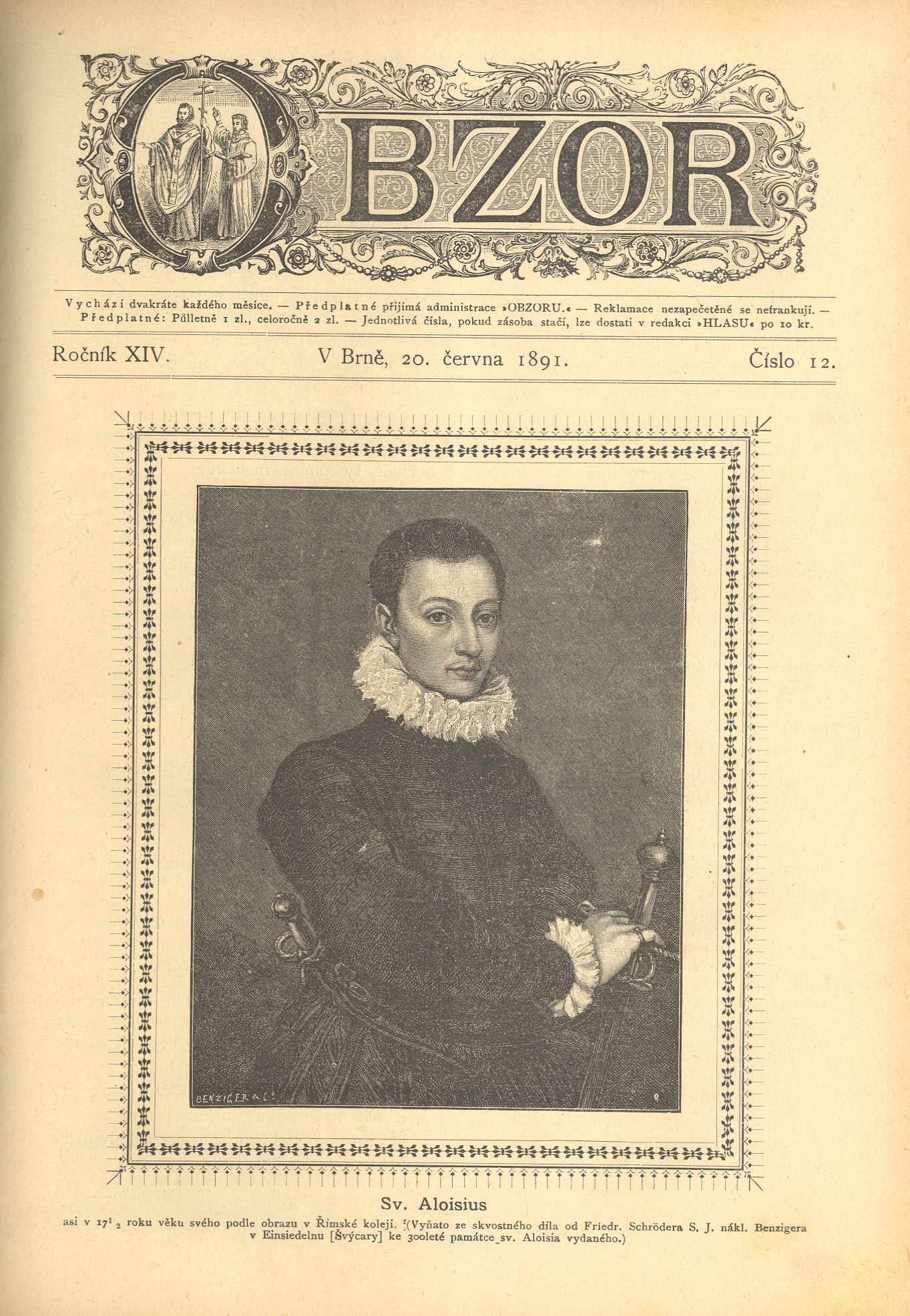 Názvové údaje Obzor : list pro poučení a zábavu Další autoři Šťastný, Vladimír, 1841-1910 (Redaktor, výkonný redaktor) (Nakladatel, vydavatel) Korp. Papežská knihtiskárna benediktinů rajhradských (Tiskař) Roč., číslo Ročník 14, číslo 1-24, 1891 Nakladatel V Brně : [Vladimír Šťastný], 1891 Výrobce Tiskem Knihtiskárny rajhradských benediktinů Rozsah 2 nečíslované strany, 366 stran : ilustrace ISSN 1803-4233 Země vyd. Česko Jazyk dok. čeština Poznámky Černobílé ilustrace, na titulní straně čísla 12 (s. 177) portrét sv. Aloise z Gonzagy, na rubu oslavná báseň Vladimíra Šťastného