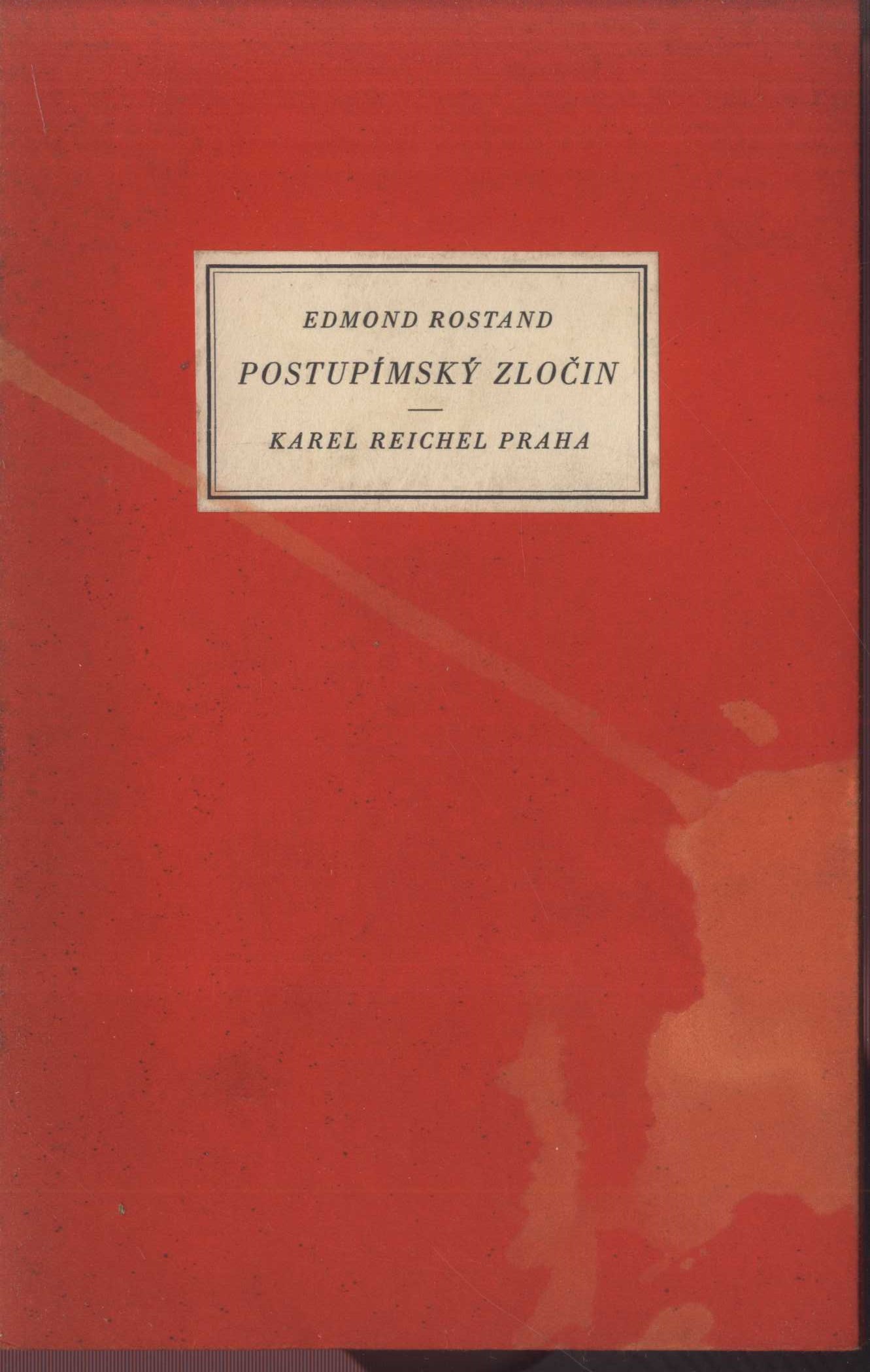 Názvové údaje Postupímský zločin / Edmond Rostand ; [přeložil Bohdan Kaminský ; doslov Jiří Karásek ze Lvovic] Osobní jméno Rostand, Edmond, 1868-1918 (Autor) Další autoři Kaminský, Bohdan, 1859-1929 (Překladatel) Karásek ze Lvovic, Jiří, 1871-1951 (Autor doslovu, tiráže atd.) (Autor podpisu) Korp. Karel Reichel (nakladatelství) (Nakladatel, vydavatel) Kryl a Scotti (firma) (Tiskař) Nakladatel Praha : Karel Reichel, 1929 Výrobce Kryl a Scotti) Rozsah 19 s. Země vyd. -cs Jazyk dok. čeština Jazyk orig. francouzština Poznámky Bibliofilie. -- Přebal z barevného tvrdého papíru (na přední straně nalepen štítek s názvem díla a jménem autora a nakladatele. -- Na protitulu poznámka nakladatele: "Vydávaje tuto báseň plním poslední přání překladatele Bohdana Kaminského [kříž] 13. VII. 1929. Nakladatel". -- Doslov Jiřího Karáska ze Lvovic. -- Sazba "kursivou Empiriana-Bodoni na ruční hadrový papír" provedena tiskárnou Kryl a Scotti. -- Náklad dvě stě číslovaných výtisků.