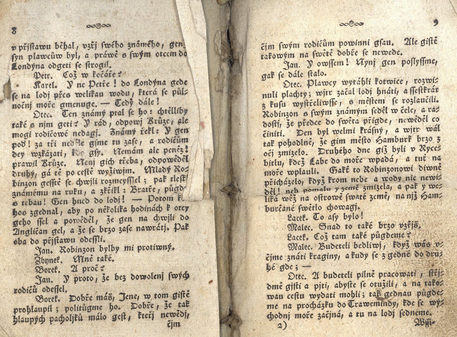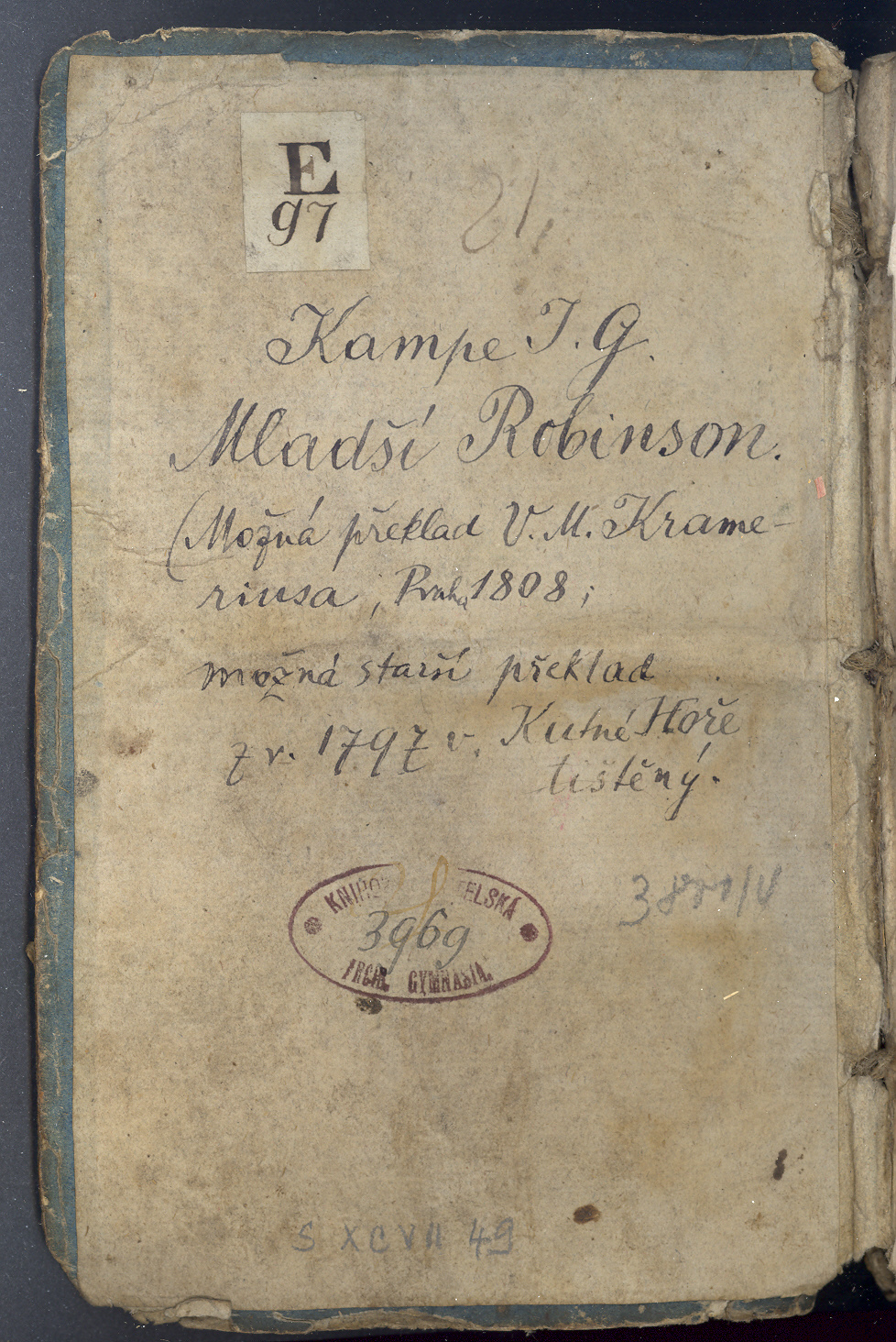 Názvové údaje [Mladssj Robinzon : knjžka zwlásstnj šlechetné mládeži Cžeské ku povčenj a wyraženj / předtjm w Němčině sepsaná od J.G. Kampe ; nynj pak w Cžeském gazyku Kraméryusowau pracý a nákladem poprwé wydaná] Osobní jméno Campe, Joachim Heinrich, 1746-1818 (Autor) Další autoři Kramerius, Václav Matěj, 1753-1808 (Překladatel) Korp. Česká expedice (vydavatelství : 1790-1848) (Nakladatel, vydavatel) Další var.názvy Mladší Robinson Knjžka wýborná šlechetné mládeži Cžeské ku povčenj a wyraženj Knížka výborná šlechetné mládeži české ku poučení a vyražení Nakladatel [W Praze : Cžeská Expedyce, 1808] Rozsah S. [5]-352. ; 17 cm ISBN (váz.) Země vyd. Česko Jazyk dok. čeština Jazyk orig. němčina Poznámky Český text gotickým písmem. -- Signatury, kustody. -- Arabské stránkování ve vnějších horních rozích. -- Ozdobné linky.