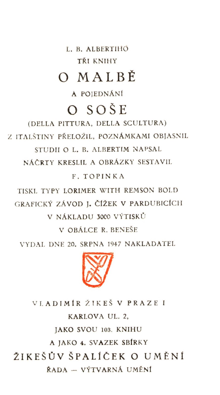 Žikešův špalíček o umění, Řada A - Výtvarná umění (Vladimír Žikeš)Země vyd. Česko Jazyk dok. čeština Jazyk orig. italština Poznámky Zdobená obálka a vazba. - Text na záložkách. - Tónované reprodukce obrbrazů na přílohách. - Poznámky v textu. - Černobílé ilustrace, nákresy v textu. - Vysvětlivky a poznámky. - Literatura. - Seznam vyobrazení. - Věcný seznam. - Obálka.