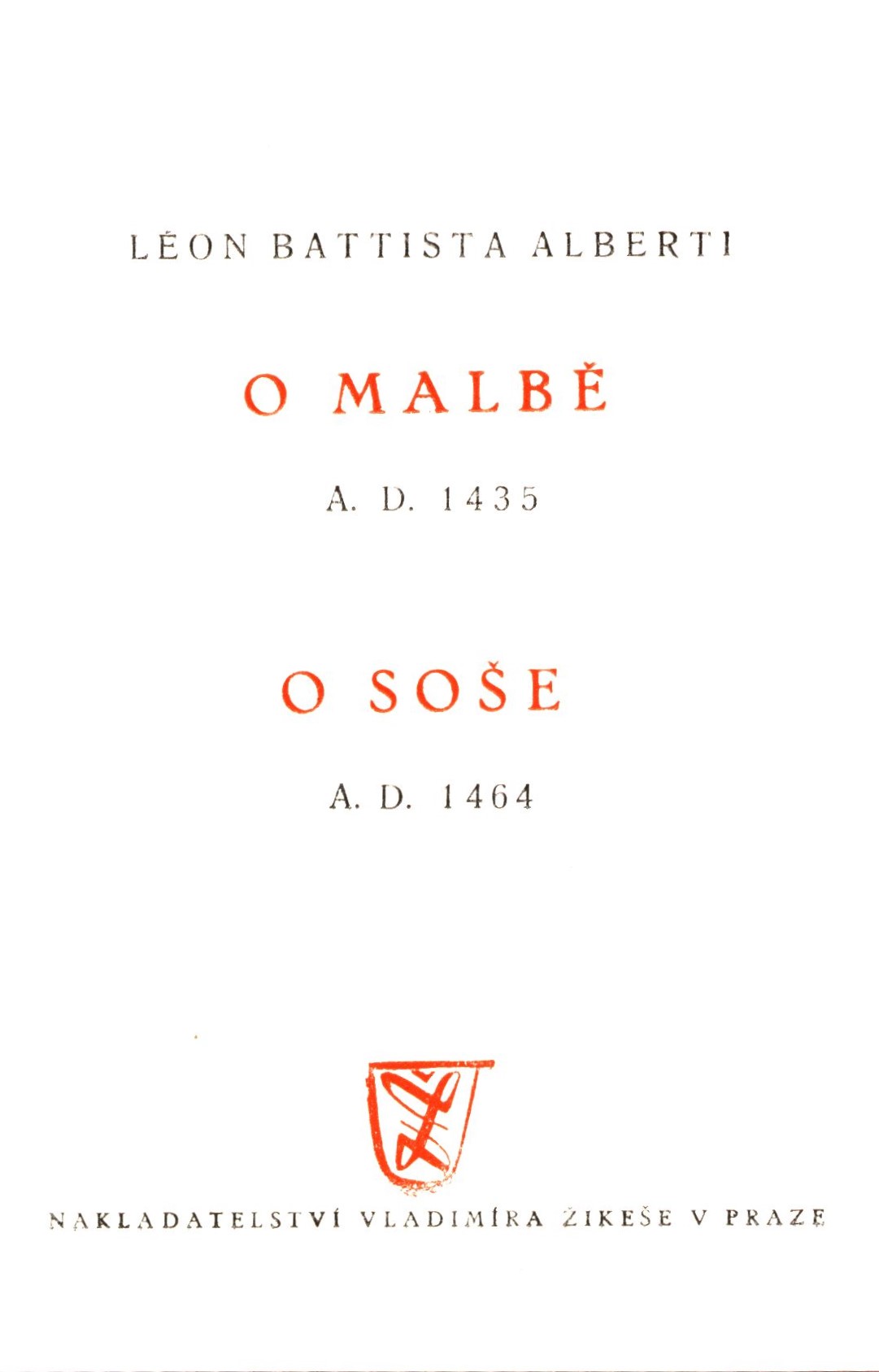 Názvové údaje O malbě, O soše / Léon Battista Alberti ; z italštiny přeložil, poznámkami objasnil, studii o L.B. Abertim napsal, náčrty kreslil a obrázky sestavil F. Topinka ; v obálce R. Beneše Osobní jméno Alberti, Leon Battista, 1404-1472 (Autor) Další autoři Topinka, F. (Překladatel) (Autor úvodu atd.) (Autor komentáře textu) (Ilustrátor) Beneš, R. (Autor obálky) Korp. Vladimír Žikeš (nakladatelství a knihkupectví) (Nakladatel, vydavatel) Grafický závod J. Čížek (Pardubice) (Tiskař) Nakladatel V Praze : Nakladatelství Vladimíra Žikeše, 1947 Výrobce V Pardubicích : Grafický závod J. Čížek Rozsah 220 stran, 4 nečíslované listy obrazových příloh : ilustrace ; 16 cm ISBN (vázáno) Edice Žikešův špalíček o umění 4. svazek