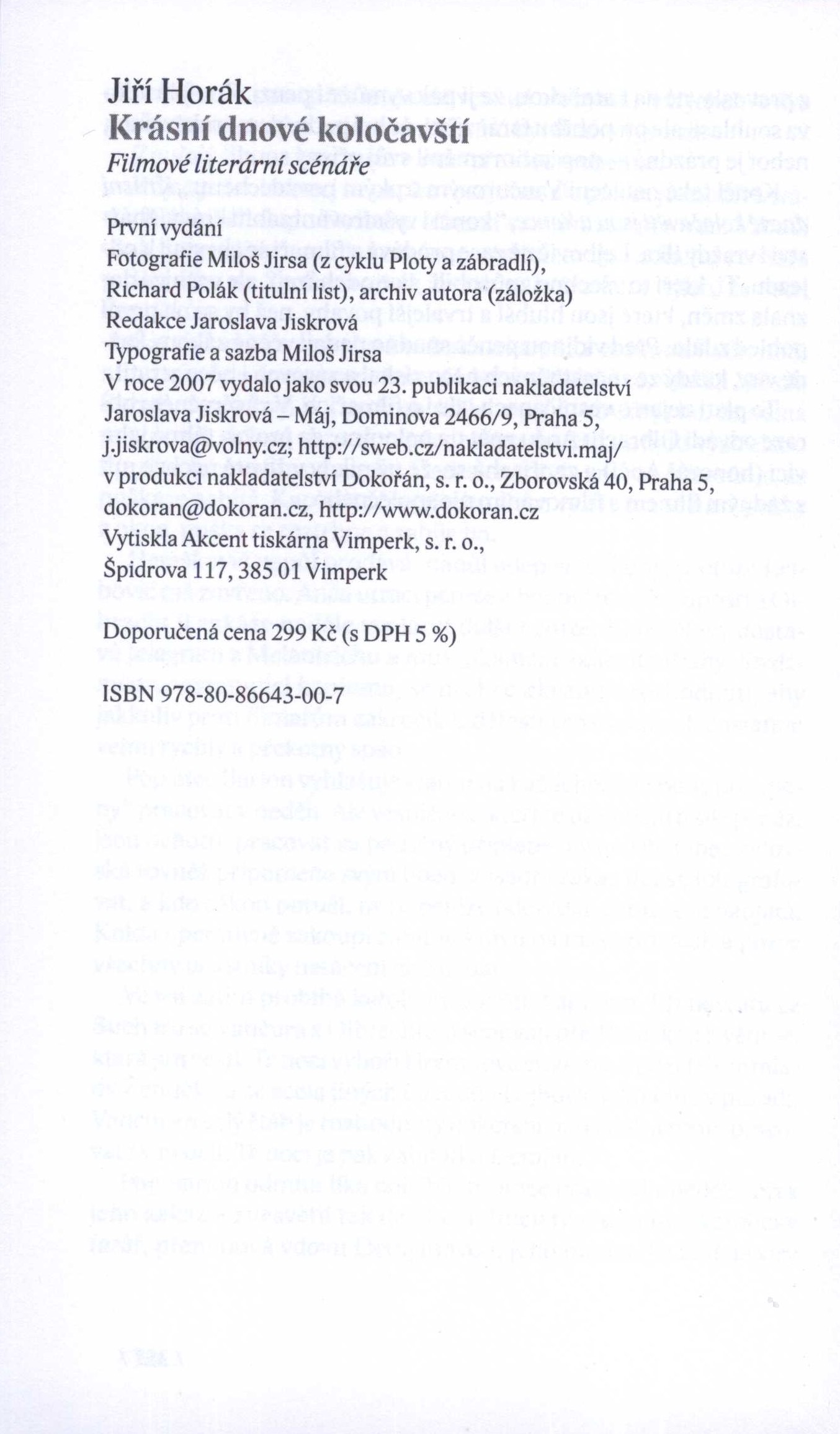 Názvové údaje Krásní dnové koločavští : filmové literární scénáře / Jiří Horák ; [fotografie Miloš Jirsa (z cyklu Ploty a zábradlí), Richard Polák (titulní ist) ; typografie Miloš Jirsa] Osobní jméno Horák, Jiří, 1940-2004 (Autor) Další autoři Jirsa, Miloš (Fotograf) (Typograf) Údaje o vydání 1. vyd. Nakladatel Praha : Jaroslava Jiskrová - Máj, 2007 Rozsah 357 s. : il. ISBN 978-80-86643-00-7 (váz.) Země vyd. Česko Jazyk dok. čeština Poznámky Zdob. přebal a předsádky. -- Na zál. přebalu pozn. o autorovi s fotem. -- Čb. fotografické ilustrace. -- Ediční poznámka.
