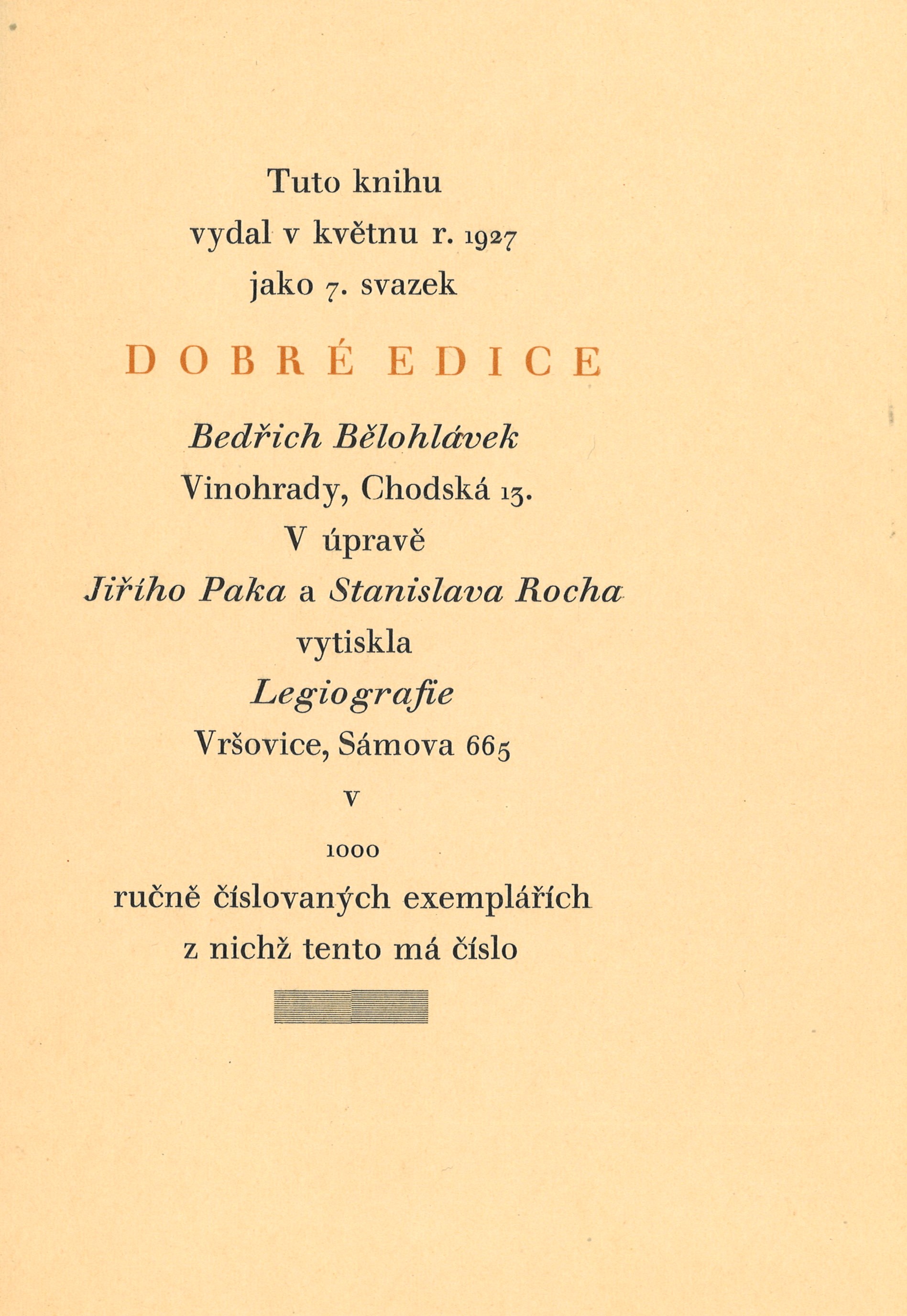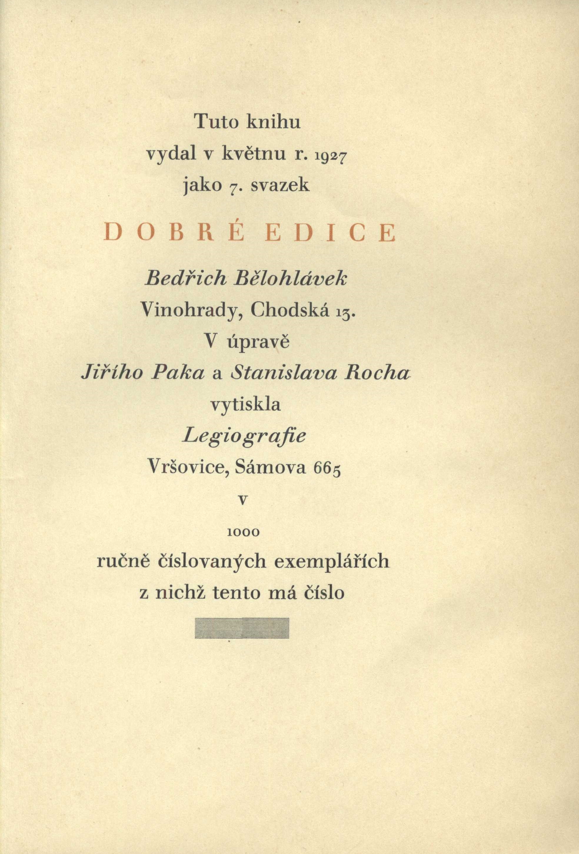 Dobrá edice (1), (Bedřich Bělohlávek)Země vyd. Česko Jazyk dok. čeština Poznámky Typografická obálka. - Dvoubarevný tisk knihy (černý a hnědý). - Náklad 1000 číslovaných exemplářů. - Bibliofilie.