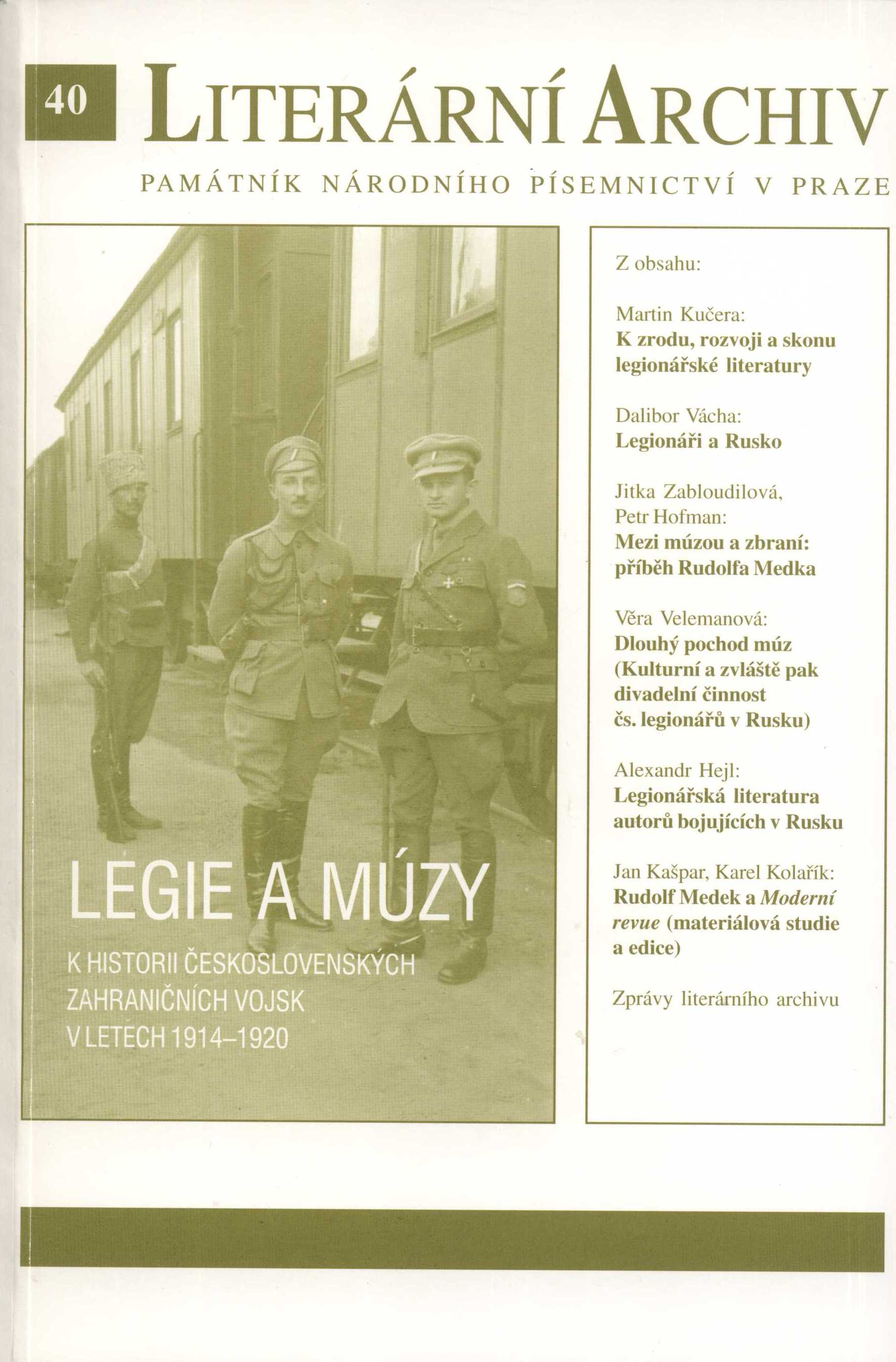 1. Názvové údajeLiterární archiv : sborník Památníku národního písemnictví = Jahrbuch des Museums der tschechischen Literatur = Annual of the Museum of the Czech Literature = Almanach du Musée de la Littérature Tchèque. Legie a múzy : k historii československých zahraničních vojsk v letech 1914-1920 / odpovědná redaktorka Jarmila Schreiberová ; grafická úprava David Martinek, Zdeněk Freisleben ; obálka a technická redakce Zdeněk Freisleben.