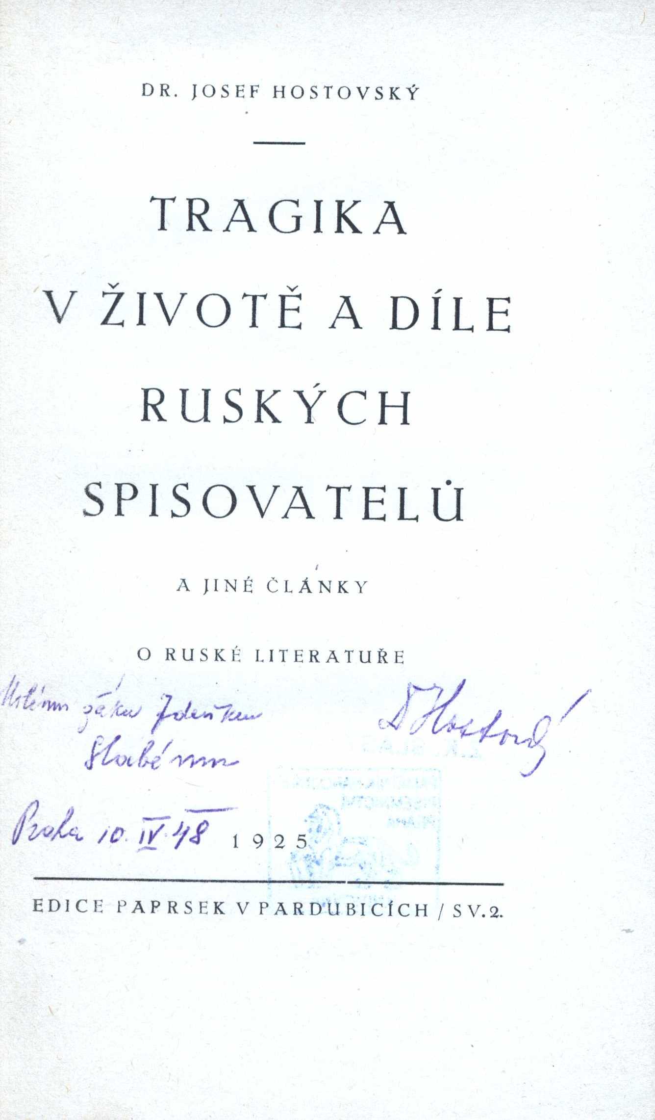 Názvové údaje Tragika v životě a díle ruských spisovatelů : a jiné články o ruské literatuře / Josef Hostovský Osobní jméno Hostovský, Josef, 1882-1965 (Autor) (Dedikátor) Další autoři Slabý, Zdeněk Karel, 1930-2020 (Dedikant) Nakladatel V Pardubicích : Vydal a vytiskl Vlastimil Vokolek, 1925 Rozsah 217 s. Edice Paprsek sv. 2