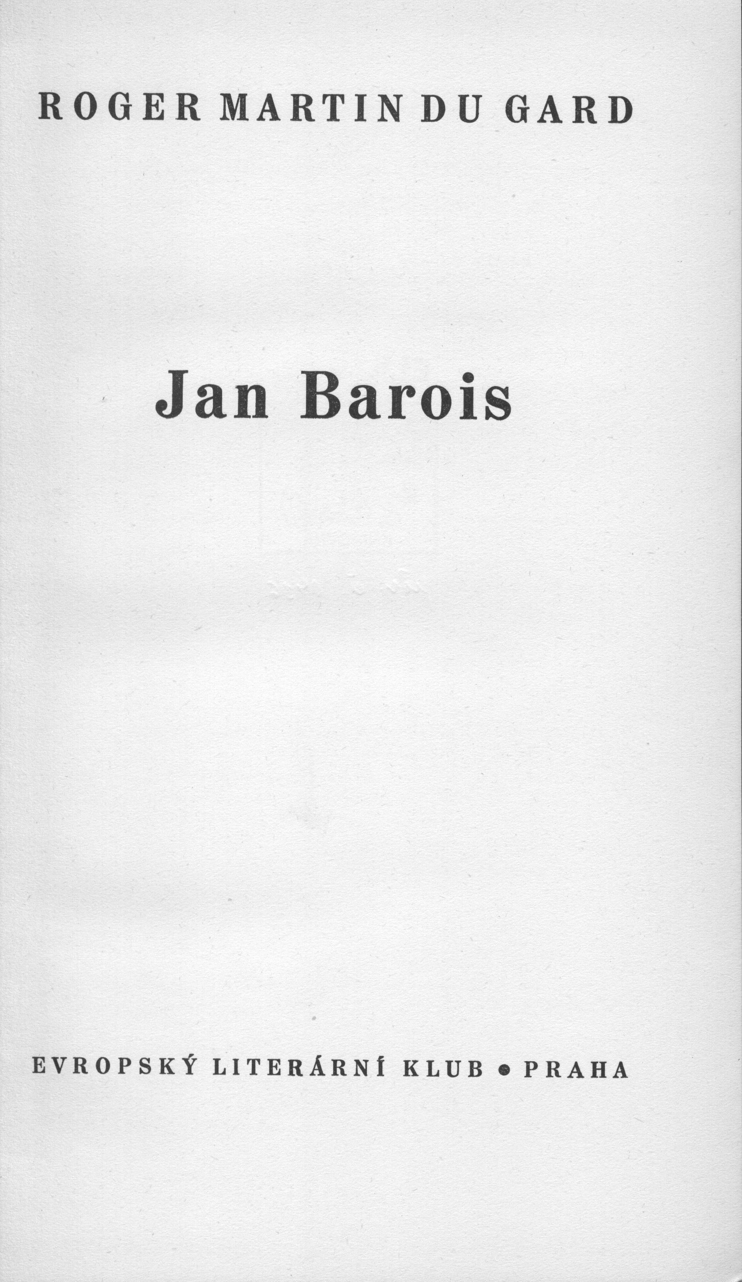 Druh dok. monografie Klíčová slova francouzská literatura * próza * překlad * román * generační román * Francie * Paříž * Dreyfusova aféra * ideové dialogy * duševní konflikty * lidské osudy * stol. 19.-20. MDT 821.133.1 * 82-3 * =030 * 82-31 * (44) Uživatelské pole PNP Kniha se sign. AVrbova 178 - Knihovna Aleny Vrbové. U knihy se sign. AVrbova 178 chybí pův. obálka. U sign. ELK 0222 typizovaná, barevná, typograficky řešená obálka (J. Štyrský) se značkou nakladatelství (J. Štyrský - neuvedeno). - Světle hnědá plátěná vazba s barevnou zdobenou ražbou (J. Štyrský). - Na přední záložce upoutávka na knihu, nakladatelská značka (J. Štyrský - neuvedeno). - Na přední předsádce razítko Archiv Čs. spisovatel, č. P 658. - Nakladatelská značka. - Patitul. - Titulní list. - Doslov: "Jan Barois. Historie a román" (J. J. Paulík). - Obsah. - Tiráž. - Na zadní záložce nakladatelské upoutávky, opakující se značka ELKu. - Na zadní straně zdobené obálky hlasy významných osobností o knihovně Slavín. - Typizované kartonové pouzdro bez nalepeného informačního štítku. Tiráž: "Roger Martin du Gard: Jan Barois. Z francouzské předlohy přeložili Miloslav Jirda (str. 1-115) a Svatopluk Kadlec (str. 116-274). Doslovem opatřil J. J. Paulík. Typografickou úpravu, obálku a vazbu navrhl Jindřich Štyrský. Písmem Ideal-News vytiskla tiskárna Orbis v Praze. Pro své členy vydal Evropský literární klub, Praha XVI, Přemyslova 16, dne 1. května 1938." Rozsah: 273, [7] s. Rozměr knihy: 21,9 cm; rozměr pouzdra: 22,4 cm Originál Jean Barois vyšel roku 1913. Signatura Přír.číslo Lokace Info AVrbova 178 0136/2010 Sbírka ELK 0222 1072/2013 Sbírka