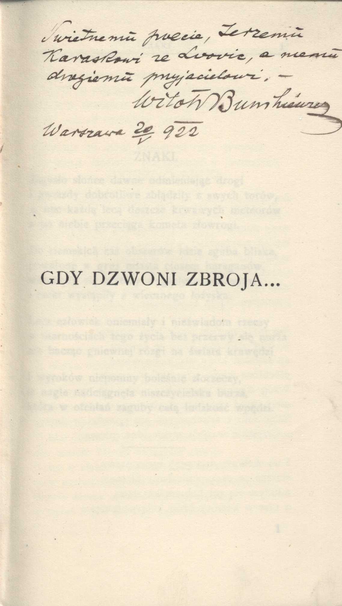Anotace (dedkg) Druh dok. monografie Klíčová slova polská literatura * polská poezie * básně * sbírka básní * balady * stol. 20., léta 20. MDT 821.162.1 * 821.162.1-1 * 82-1 * (0:82-144) Uživatelské pole PNP Signatura KaG XI B 22: Původní brož, obálka zachována. - Zachovalý stav. Signatura KaG XI B 22: Na s. 3 rukopisná dedikace Witolda Bunikiewicze Jiřímu Karáskovi ze Lvovic: "Świetnemu poecie, Jerzemu Karaskowi ze Lvovic, a memu dragiemu przyjacielowi. - Witołd Bunikiewicz Warszawa 20/V 922." U sign. KaG XI B 22: "W Krakowie - Drukarnia Uniwersytetu Jagiellońskiego pod zarządem Józefa Filipowskiego." - Na s. 3 dedikace perem: "Świetnemu poecie, Jerzemu Karaskowi ze Lvovic, a memu dragiemu przyjacielowi. - Witołd Bunikiewicz Warszawa 20/V 922." Signatura Přír.číslo Lokace Info KaG XI B 22 xxx/KAG Sbírka