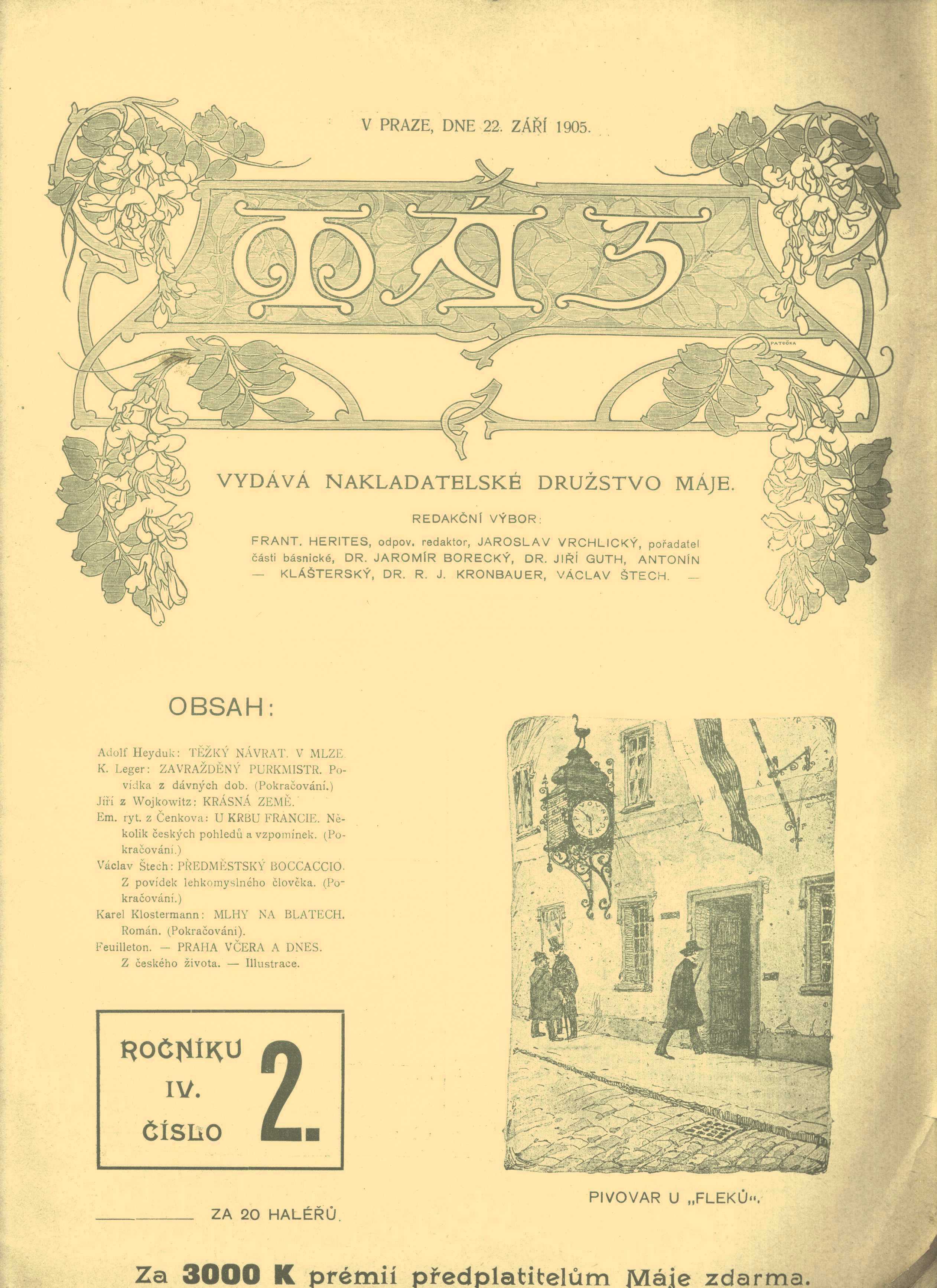 Názvové údaje Máj Další autoři Hellmuthová, Věra, 1891-1940 (Dřívější majitel) Herites, František, 1851-1929 (Šéfredaktor, odpovědný redaktor) Dráb, Petr, 1881-1971 (Ilustrátor) Kronbauer, Rudolf Jaroslav, 1864-1915 (Editor) Vrchlický, Jaroslav, 1853-1912 (Editor) Borecký, Jaromír, 1869-1951 (Editor) Guth-Jarkovský, Jiří Stanislav, 1861-1943 (Editor) Klášterský, Antonín, 1866-1938 (Editor) Štech, Václav, 1859-1947 (Editor) Konůpek, Jan, 1883-1950 (Ilustrátor) Korp. Nakladatelské družstvo Máje (Nakladatel, vydavatel) Dr. Ed. Grégr a syn (nakladatelství, tiskárna) (Tiskař) Roč., číslo Ročník 4, číslo 1-52, 1905/1906 Nakladatel V Praze : Nakladatelské družstvo Máje, 1905-1906 Výrobce Tiskem knihtiskárny dr. Ed. Grégra a syna Rozsah 825, iii strany obsahu ročníku : ilustrace, portréty, faksimile; 31 cm Země vyd. Česko Jazyk dok. čeština Poznámky Zdobená obálka: stejné ornamentální záhlaví a různé reprodukované dílo na přední straně. - Faksimile rukopisů. - Černobílé ilustrace (kresby, fotografie míst i osob, portréty, reprodukce výtvarných děl apod.). - Ilustrace Jana Konůpka. - Množství reklamních příloh (nepaginované reklamní stránky sousedící s obálkou, na nichž byla také tiráž a případná zaslána). - Iniciálová výzdoba. - Č. 15-16 bylo vánoční dvojčíslo. - Číslo 24 bylo masopustní a bylo ilustrováno karikaturami J. Líra.