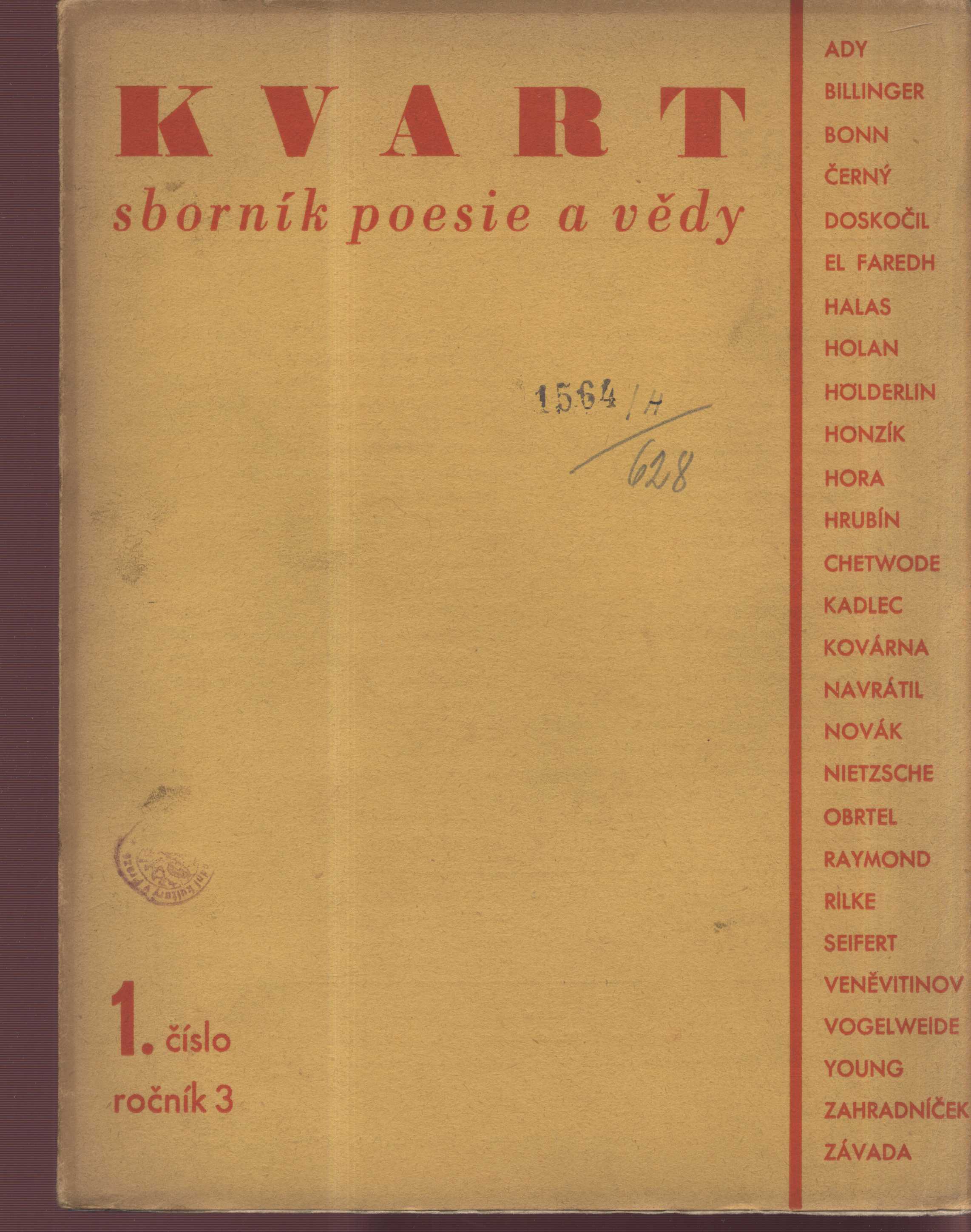 Anotace Významná česká umělecká revue, zaměřená na slovesné i výtvarné umění, filosofii a estetiku, kterou redigoval s kruhem spolupracovníků Vít Obrtel. V časopisu vycházely básně, povídky, eseje a studie autorů různých epoch, pochopitelně včetně té aktuální. Vznikal tak pozoruhodný dialog na téma život a umění, potažmo život a tvorba. Z českých autorů zde publikovali např. Josef Hora, František Hrubín, Jan Zahradníček nebo Jan Patočka. - (kkper) Druh dok. PERIODIKA - Svázaný ročník periodika Periodicita čtvrtletně Nadřízená jednotka Kvart Osobní hesla Mácha, Karel Hynek, 1810-1836 - básník, beletrista, dramatik * Feuerstein, Bedřich, 1892-1936 - architekt, scénograf, malíř a esejista Klíčová slova česká literatura * světová literatura * časopis * časopisy * české časopisy * revue * umělecká revue * literární revue * česká poezie * světová poezie * eseje * filozofické eseje * literárněkritické eseje * studie * estetika * estetika umění * filozofie * avantgarda * avantgardní umění * česká avantgarda * česká meziválečná avantgarda * literární avantgarda * meziválečná avantgarda * výtvarná avantgarda * stol. 20., léta 30. * r. 1936-1937 MDT 821.162.3 * (051) * 821.162.3-92 * 821.162.3-1 * 82-4 * 1 Bývalí majitelé Tomeš, Jan Marius, 1913-2010 Tomeš Jan Marius 1913-2010 Uživatelské pole PNP Signatura KaG XXXVII B 20: Kompletní nesvázaný ročník s obálkami. - Zachovalý stav. Sign. Aa 2032: volná nesvázaná čísla v barevném kartonu, kompletní ročník včetně obálek. - Knihovna J.M. Tomeše. Sign. Q15 F8: černá poloplátěná vazba, zlacený hřbetní název, kompletní ročník, obálky vevázány na konci svazku. Signatura VHB 1564/3: Kompletní nesvázaný ročník s obálkami. - Zachovalý stav. - Nerozřezáno. Signatura Přír.číslo Lokace Info KaG XXXVII B 20 xxx/KAG Sbírka Aa 2032 0695/2012 Sbírka Q 15F8 1393/52 Fond VHB 1564/3 1564/H Sbírka