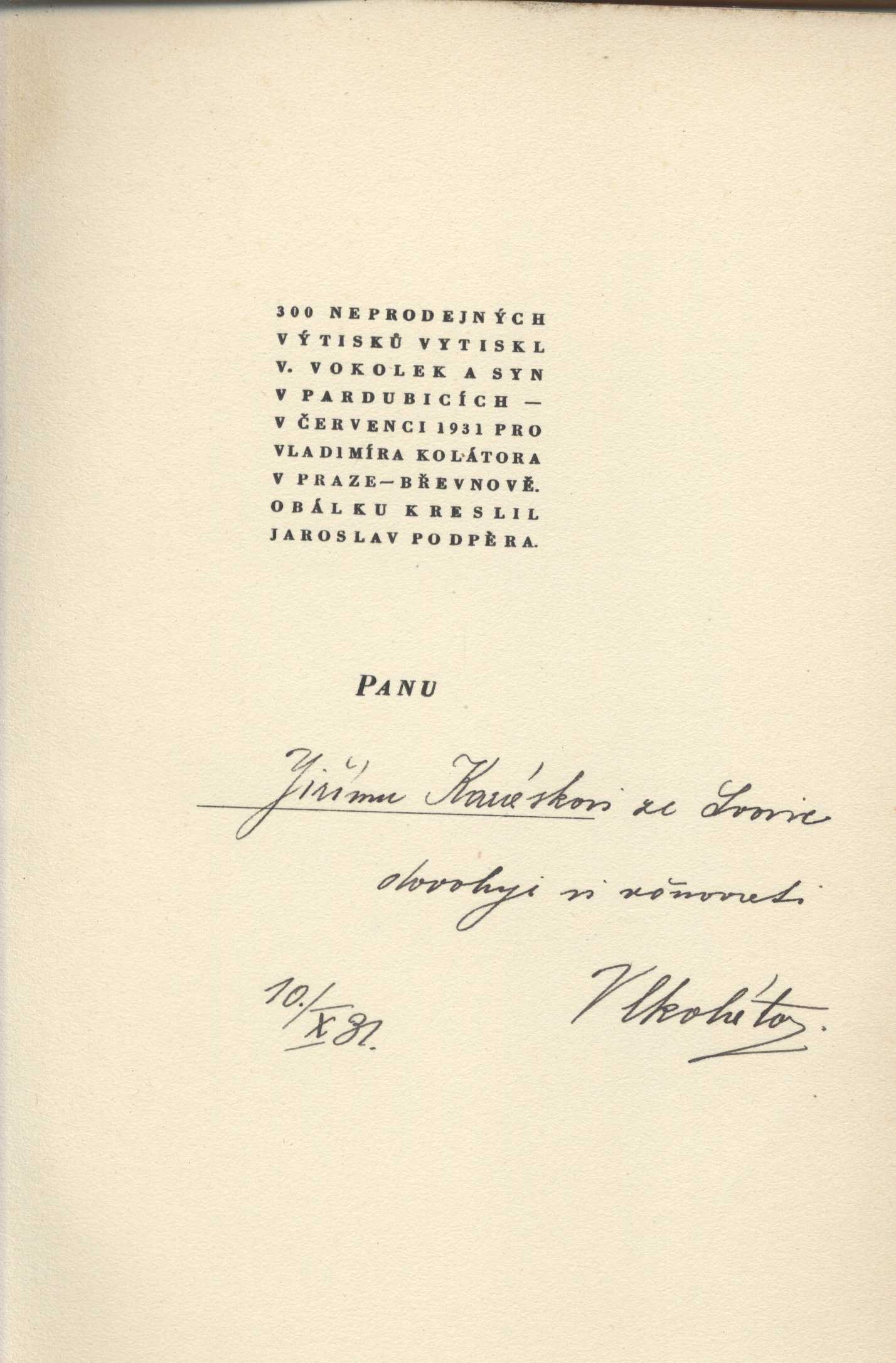 Názvové údaje O Vladimíru Gamzovi / Vladimír Kolátor ; [obálku kreslil Jaroslav Podpěra] Osobní jméno Kolátor, Vladimír, 1903-1986 (Autor) (Dedikátor) Další autoři Podpěra, Jaroslav, nar. 1906 (Autor obálky) Karásek ze Lvovic, Jiří, 1871-1951 (Dedikant) Korp. Vokolek, Václav (tiskárna : Pardubice) (Tiskař) Nakladatel Praha, 1931 Výrobce V. Vokolek a syn) Rozsah 62, 4 s., [9] l. obr. příl. : il. ISBN brož. Země vyd. Česko Jazyk dok. čeština Poznámky Barevná zdobená obálka. - Devět listů obrazové přílohy na křídovém papíře s černobílými fotografiemi (jedna jako frontispis). - Seznam členů Gamzova studia v další své činnosti. - Obsahuje samostatně paginovaný dvojlist Vladimír Kolátor: Poznámky k "Divadlu na rozcestí" (4 s.). - "300 neprodejných výtisků vytiskl V. Vokolek a syn v Pardubicích - v červenci 1931 pro Vladimíra Kolátora v Praze-Břevnově. Obálku kreslil Jaroslav Podpěra."