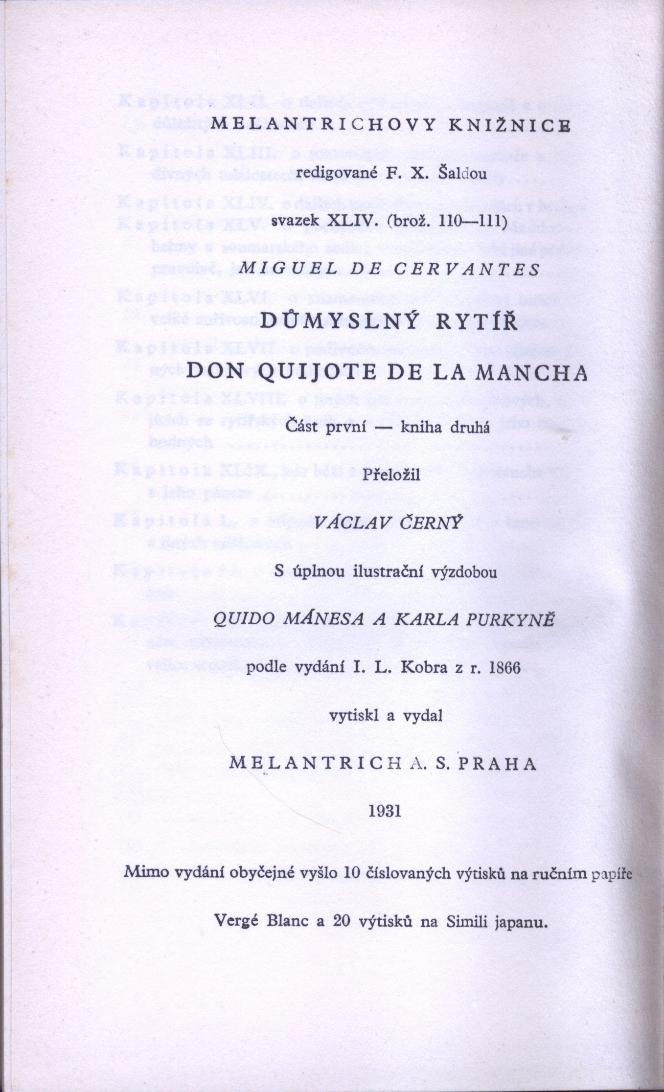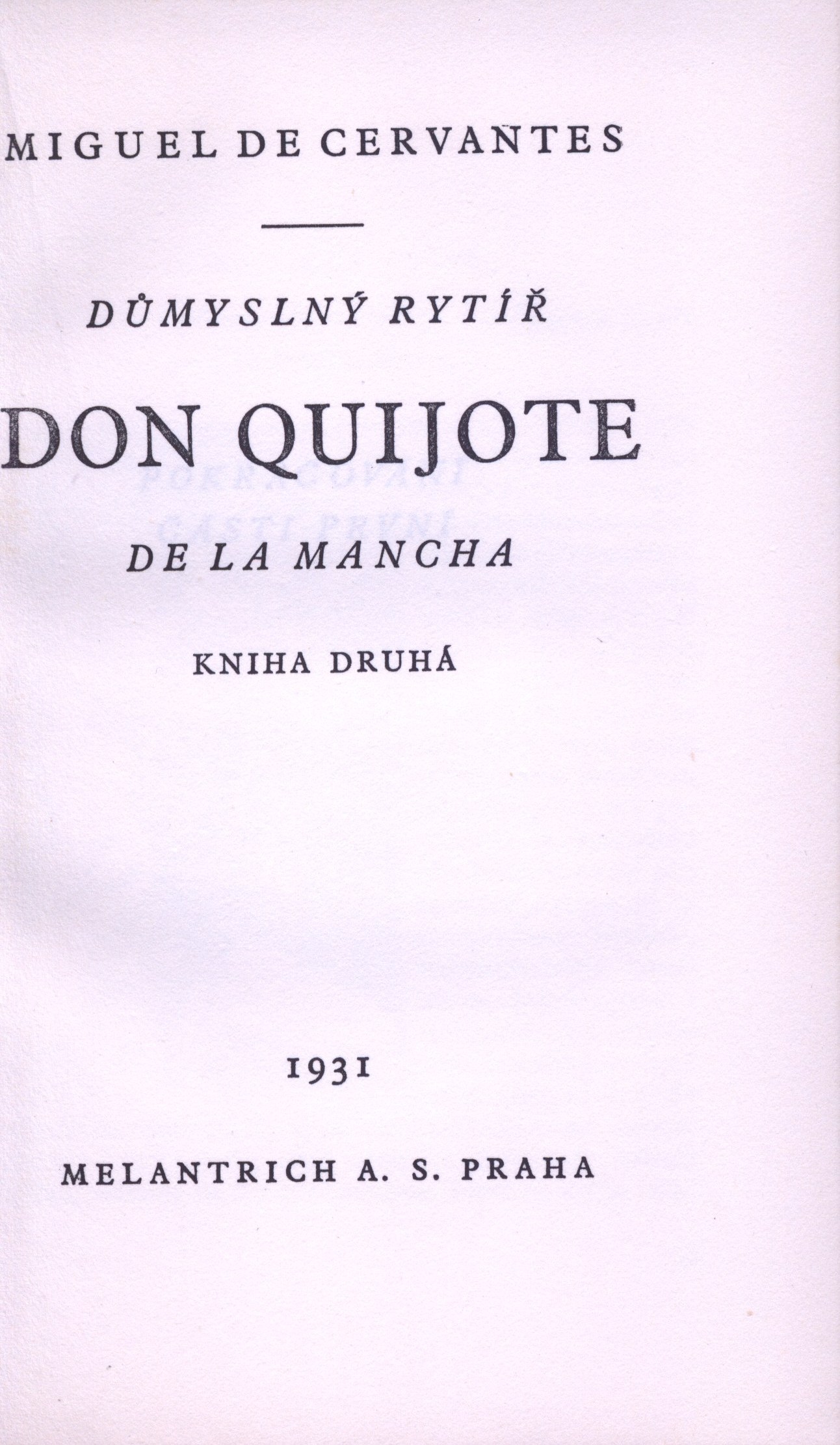 Druh dok. monografie Obálkový název Don Quijote II. Klíčová slova španělská literatura * próza * román * překlad * parodie * rytířský román * Don Quijote * ilustrované knihy MDT 821.134.2 * 82-3 * 82-31 * =030 * 82-7 Uživatelské pole PNP U sign. OŘíha 032 původní barevně zdobená fotoobálka. - Modrá plátnová vazba s ražbou (typizovaná nakladatelská vazba). - Na záložkách upoutávky na knihu. - Na vakátě původní nakladatelská značka. - Edice. - Titulní list. - U kapitol černobílé ilustrace v textu (Q. Mánes a K. Purkyně). - Obsah. - Tiráž, kde uvedeno: "Melantrichovy knižnice redigované F. X. Šaldou svazek XLIV (brož. 110-111). Miguel de Cervantes Důmyslný rytíř Don Quijote de la Mancha. Část první - kniha druhá. Přeložil a předmluvu napsal Václav Černý. S úplnou ilustrační výzdobou Quido Mánesa a Karla Purkyně podle vydání I. L. Kobra z r. 1866 vytiskl a vydal Melantrich a. s. Praha 1931. Mimo vydání obyčejné vyšlo 10 číslovaných výtisků na ručním papíře Vergé Blanc a 20 výtisků na Simili japanu." - Na zadní straně obálky ediční upoutávky. - Původní obálka po degradaci papíru v horní části narušená a u hřbetu natžená; vazba zachovaná, blok knihy se mezi stranami 162 a 163 rozestupuje; listy v krajích s hnědavými skvrnkami. - Kromě obálky zachovalý výtisk. Signatura P 41 G 2: Původní modrá plátěná vazba. - Bez přebalu. Signatura Přír.číslo Lokace Info OŘíha 032 1852/2010 Sbírka P 41 G 2 6754/65 Sbírka