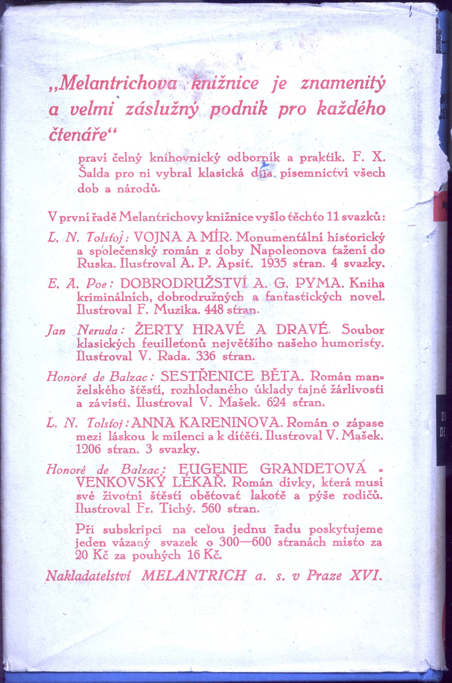 Melantrichova knižnice, (Melantrich)Země vyd. Česko Jazyk dok. čeština Jazyk orig. španělština Poznámky Zdobená obálka. - Na přední záložce upoutávka na knihu. - Typizovaná vazba s ražbou. - Na vakátě původní nakladatelská značka. - Edice. - Titulní list. - Černobílé ilustrace v textu. - Obsah. - Tiráž. - Poznámka na zadní záložce. - Ediční upoutávka na zadní straně obálky.