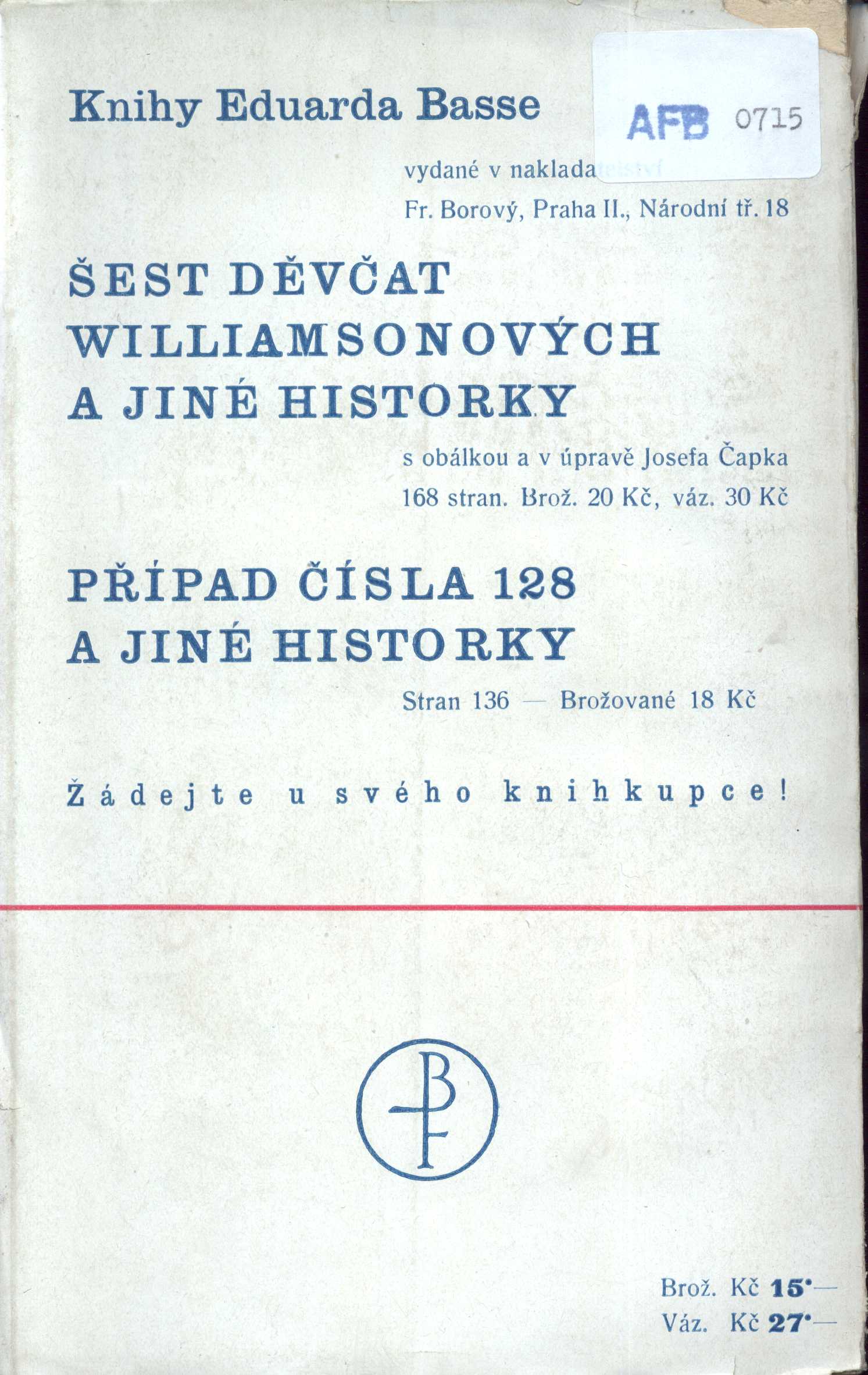 Druh dok. monografie Klíčová slova česká literatura * próza * literatura pro mládež MDT 821.162.3 * 82-3 Uživatelské pole PNP Sign. AFB 0715 na vakátě razítko Archiv Fr. Borový č. P1301, na vakátě podpis autora. Signatura Přír.číslo Lokace Info AFB 0715 0792/AFB Sbírka