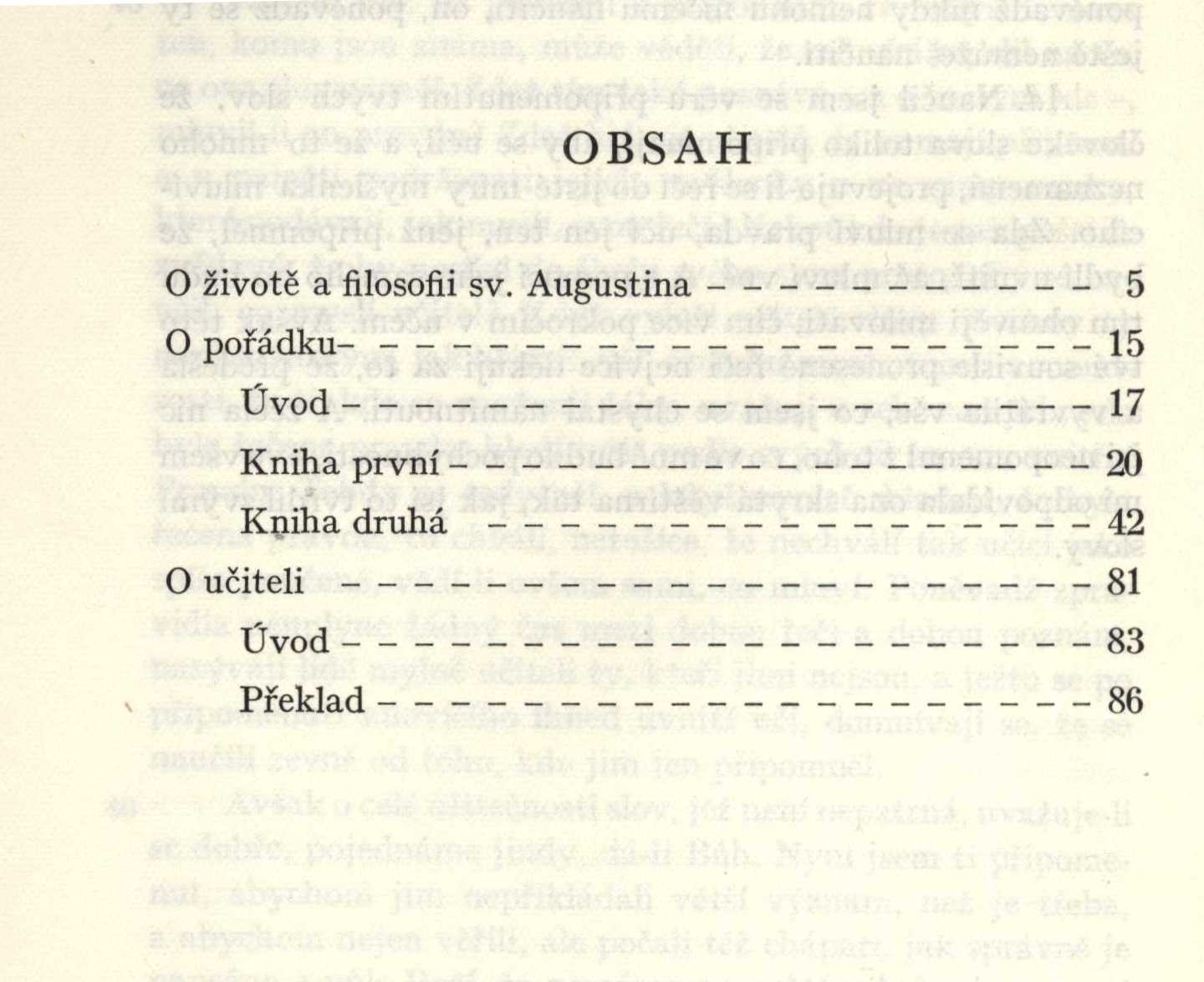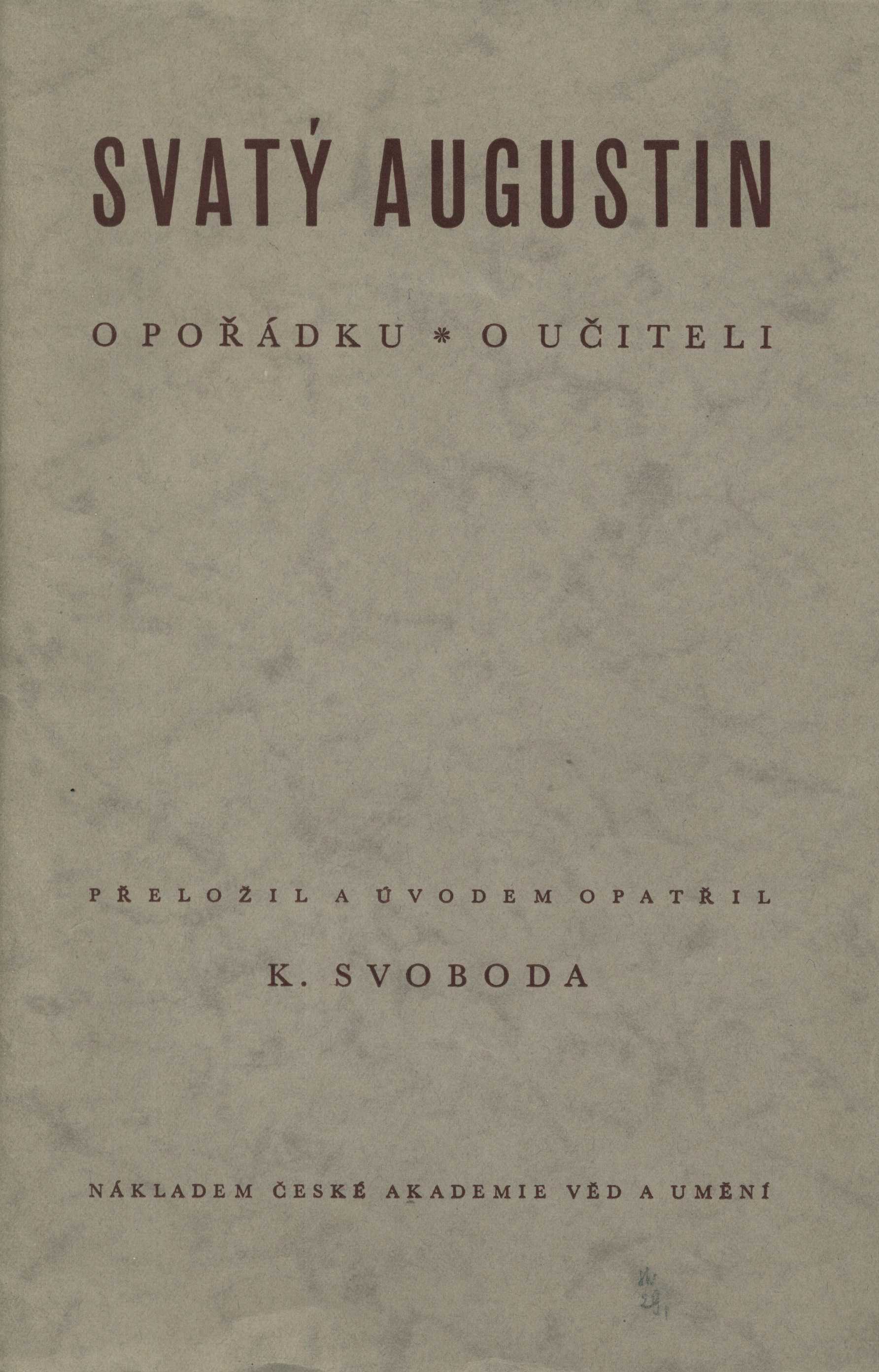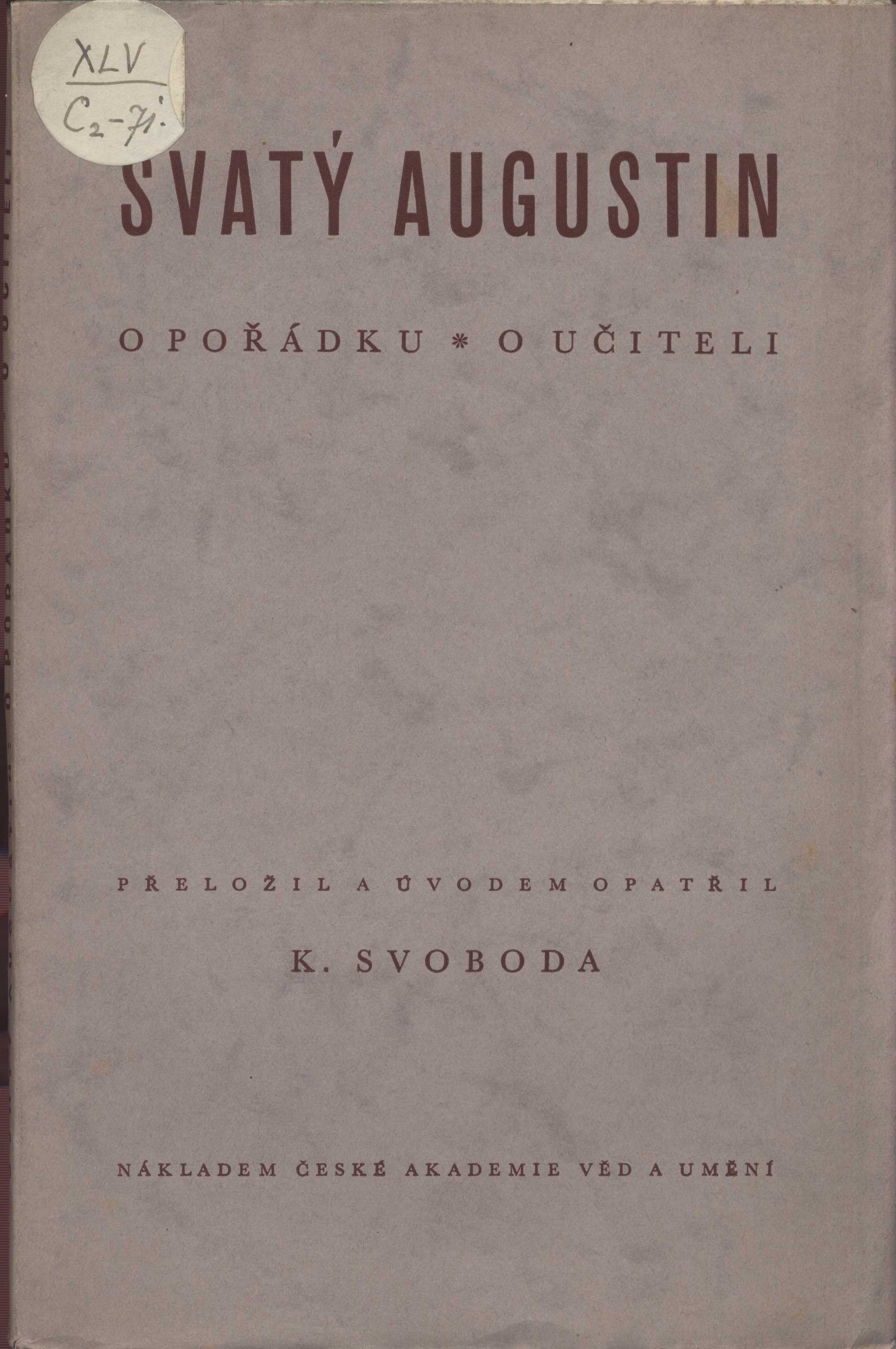 Názvové údaje O pořádku ; O učiteli / Svatý Augustin ; přeložil a úvodem opatřil K. Svoboda Autor Augustin, svatý, 354-430 (Autor) Další autoři Svoboda, Karel, 1888-1960 (Překladatel) (Autor úvodu atd.) Teuchner, Jindřich, 1901-1985 (Dárce) Korp. Česká akademie věd a umění (Nakladatel, vydavatel) Česká grafická Unie (tiskárna a nakladatelství) (Tiskař) Další var.názvy O učiteli Nakladatel V Praze : Nákladem České akademie věd a umění, 1942 Výrobce Tiskem České grafické unie Rozsah 127 stran ISBN (Brožováno) Edice Filosofická bibliotéka. řada 2 ; číslo 2