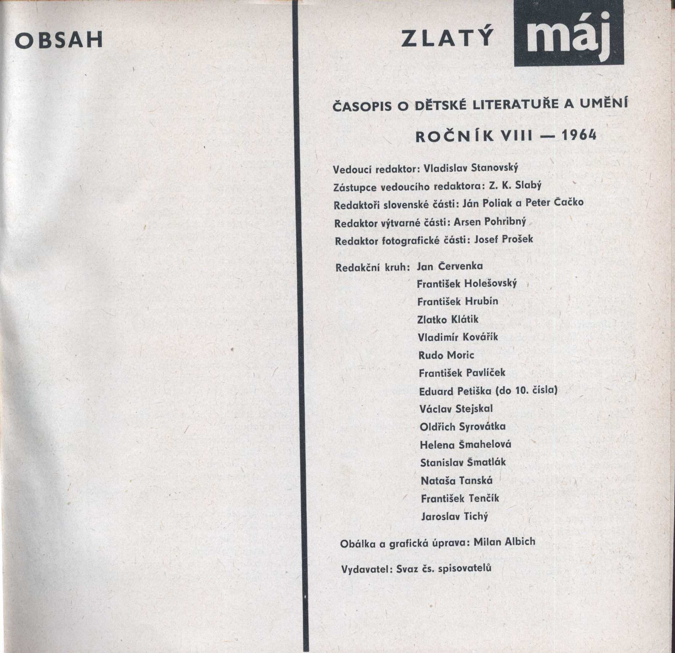 Názvové údaje Zlatý máj : časopis o dětské literatuře a umění Další autoři Stanovský, Vladislav, 1922-2005 (Editor) Slabý, Zdeněk Karel, 1930-2020 (Editor) Poliak, Ján, 1929-1977 (Editor) Čačko, Peter, 1936- (Editor) Albich, Milan, 1925-2000 (Autor obálky) (Knižní grafik) Korp. Svaz československých spisovatelů (Nakladatel, vydavatel) Roč., číslo ročník 8, číslo 1-12, 1964 Nakladatel Praha ; Bratislava : Svaz čs. spisovatelů, 1964 Rozsah il. ISSN 0044-4871 Země vyd. Česko Jazyk dok. čeština * slovenština Poznámky Čb. ilustrace a fotografie. - Český a slovenský text.