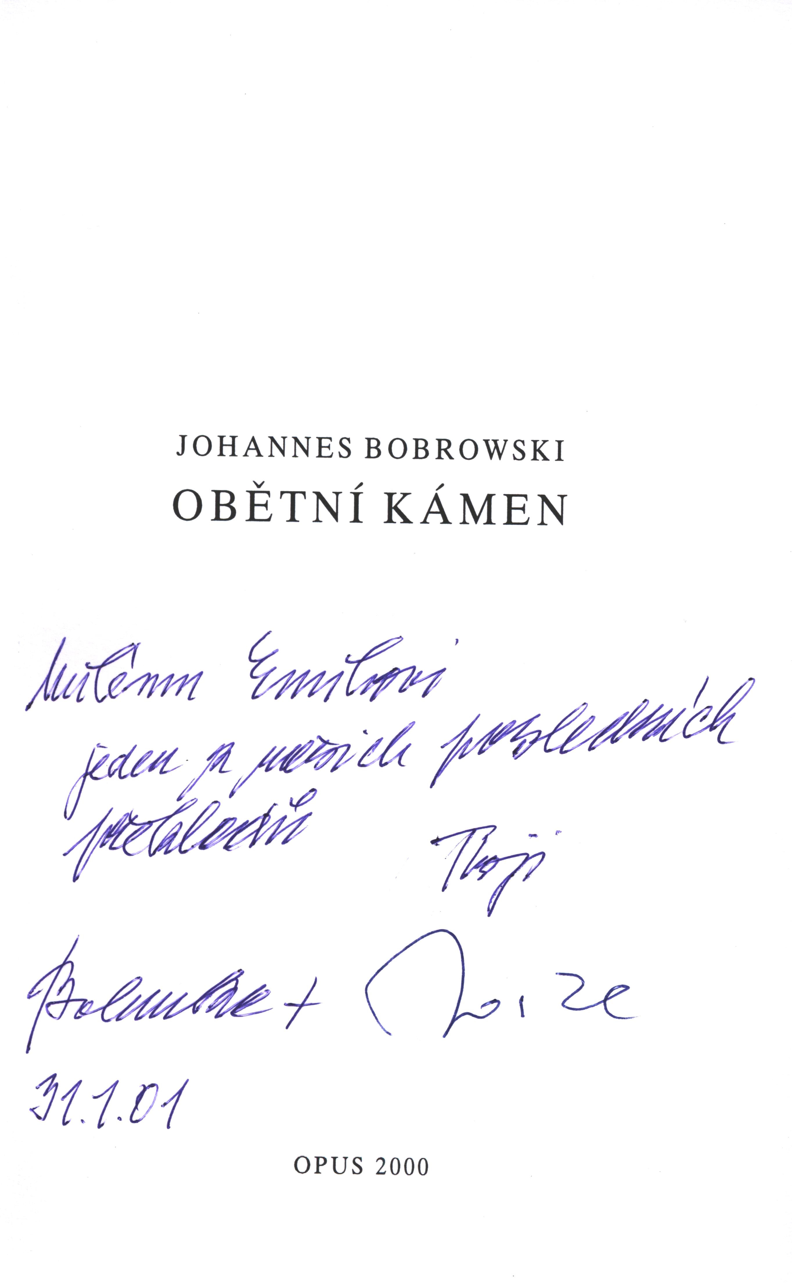 Názvové údaje Obětní kámen / Johannes Bobrowski ; [z německých originálů uvedených v ediční poznámce vybrali, přeložili a doslov napsali Josef Hiršal a Bohumila Grögerová ; typografie Jiří Mědílek] Osobní jméno Bobrowski, Johannes, 1917-1965 (Autor) Další autoři Grögerová, Bohumila, 1921-2014 (Sestavovatel, kompilátor) Hiršal, Josef, 1920-2003 (Sestavovatel, kompilátor) (Překladatel) (Autor doslovu, tiráže atd.) Mědílek, Jiří, 1954- (Typograf) Korp. Opus (nakladatelství) (Nakladatel, vydavatel) Údaje o vydání V tomto souboru vyd. 1. Nakladatel Studnice : Opus, 2000 Rozsah 135 s. ; 20 cm ISBN 80-238-3524-6 (brož.) Edice Opus sv. 3