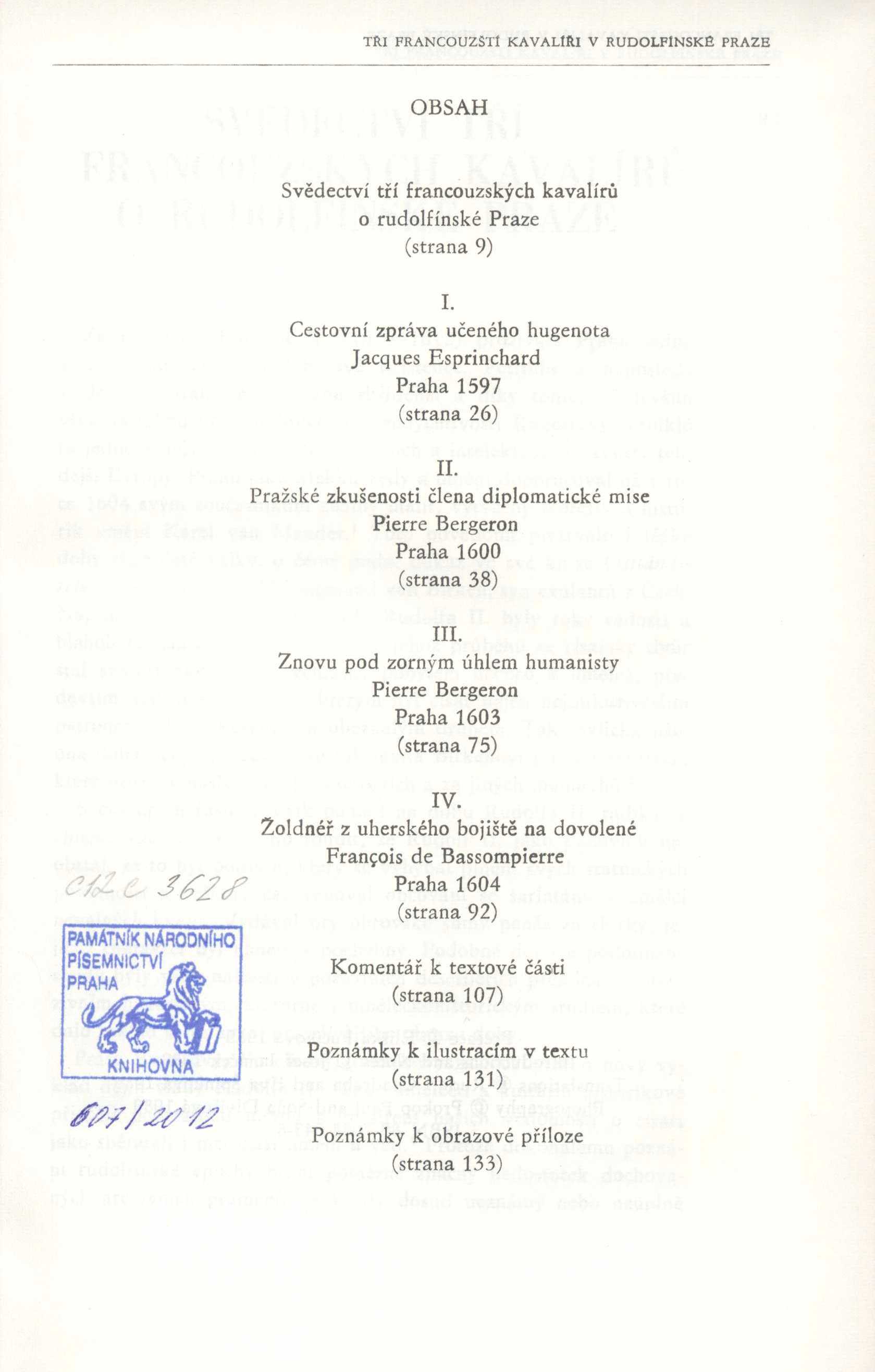 Názvové údaje Tři francouzští kavalíři v rudolfínské Praze / Jacques Esprinchard, Pierre Bergeron, François de Bassompierre ; [sestavila a úvodem opatřila Eliška Fučíková ; vstupními studiemi a poznámkami opatřil Josef Janáček ; pasáže z knih ... přeložila Eva Špinková ; z rukopisů přeložil Rudolf Chardraba. itineráře nakreslila Vlasta Srbová. obálku a grafickou úpravu navrhl Michal Houba] Další autoři Fučíková, Eliška, 1940- (Sestavovatel, kompilátor) (Autor úvodu atd.) Janáček, Josef, 1925-1994 Špinková, Eva (Překladatel) Chadraba, Rudolf, 1922-2011 (Překladatel) Srbová, Vlasta (Ilustrátor) Houba, Michal, 1958- (Knižní grafik) (Autor obálky) Bergeron, Pierre, asi 1575-1637 (Autor) Esprinchard, Jacques, 1573-1604 (Autor) Bassompierre, François de, 1579-1646 (Autor) Údaje o vydání 1. vyd. Nakladatel V Praze : Panorama, 1989 Výrobce Tisk, knižní výroba) Rozsah 133 s., [8] s. obr. příl. : il., portréty, faksim., mapy ISBN (váz.) Edice Pragensia. Svědectví o Praze