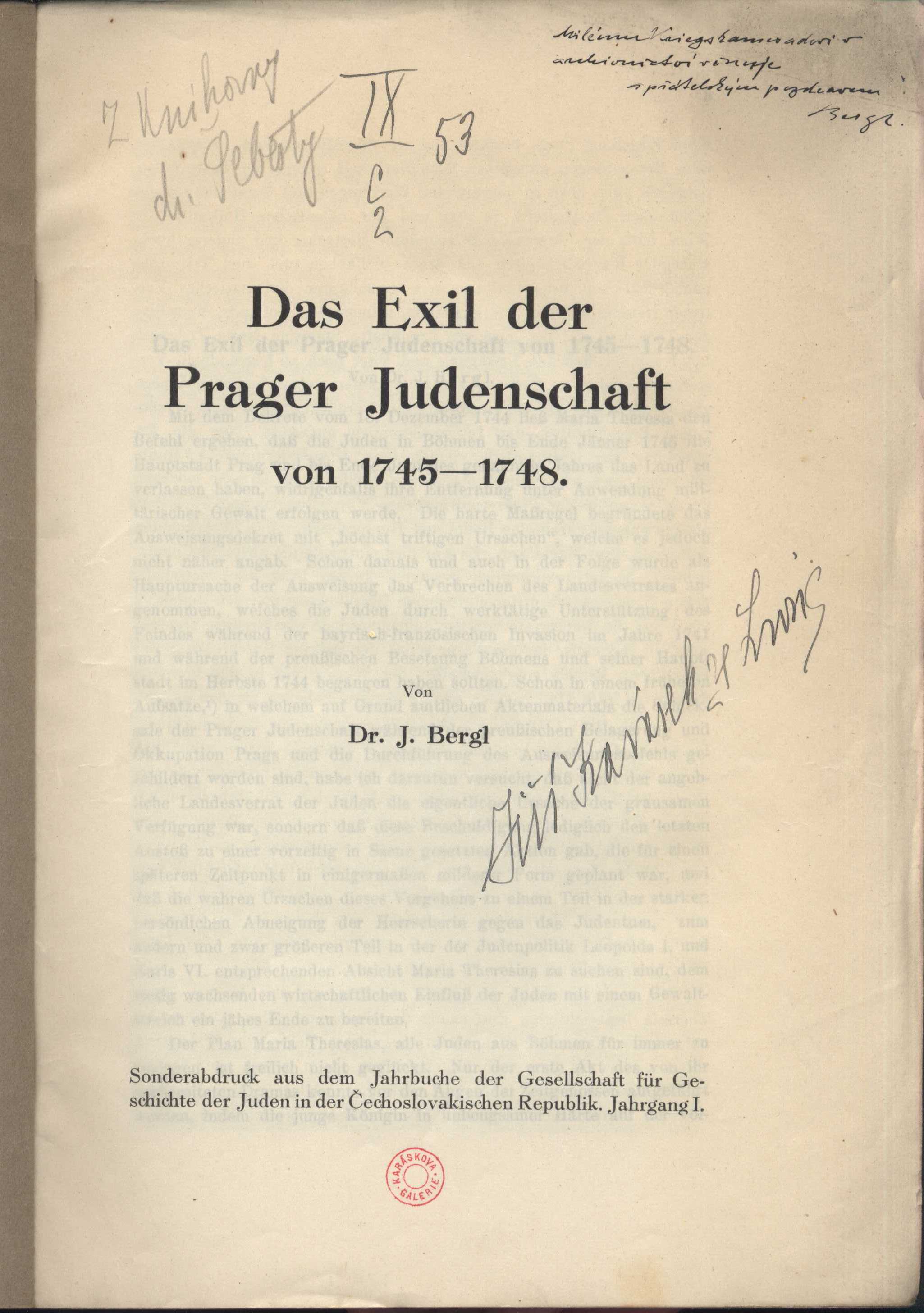 Názvové údaje Das Exil der Prager Judenschaft von 1745-1748 / von J. Bergl Osobní jméno Bergl, Josef, 1874-1952 (Dedikátor) (Autor) Další autoři Šebesta, Eduard, 1879-1933 (Dřívější majitel) (Dedikant) Karásek ze Lvovic, Jiří, 1871-1951 (Autor podpisu) Nakladatel [S. l. : s. n., 19--] Rozsah 71 s. ISBN brož. Země vyd. Česko Jazyk dok. němčina Poznámky Separát (Jahrbuch der Gesellschaft für Geschichte der Juden in der Čechoslovakischen Republik, Jahrgang I.). - Poznámkový aparát. - Bibliografické údaje.