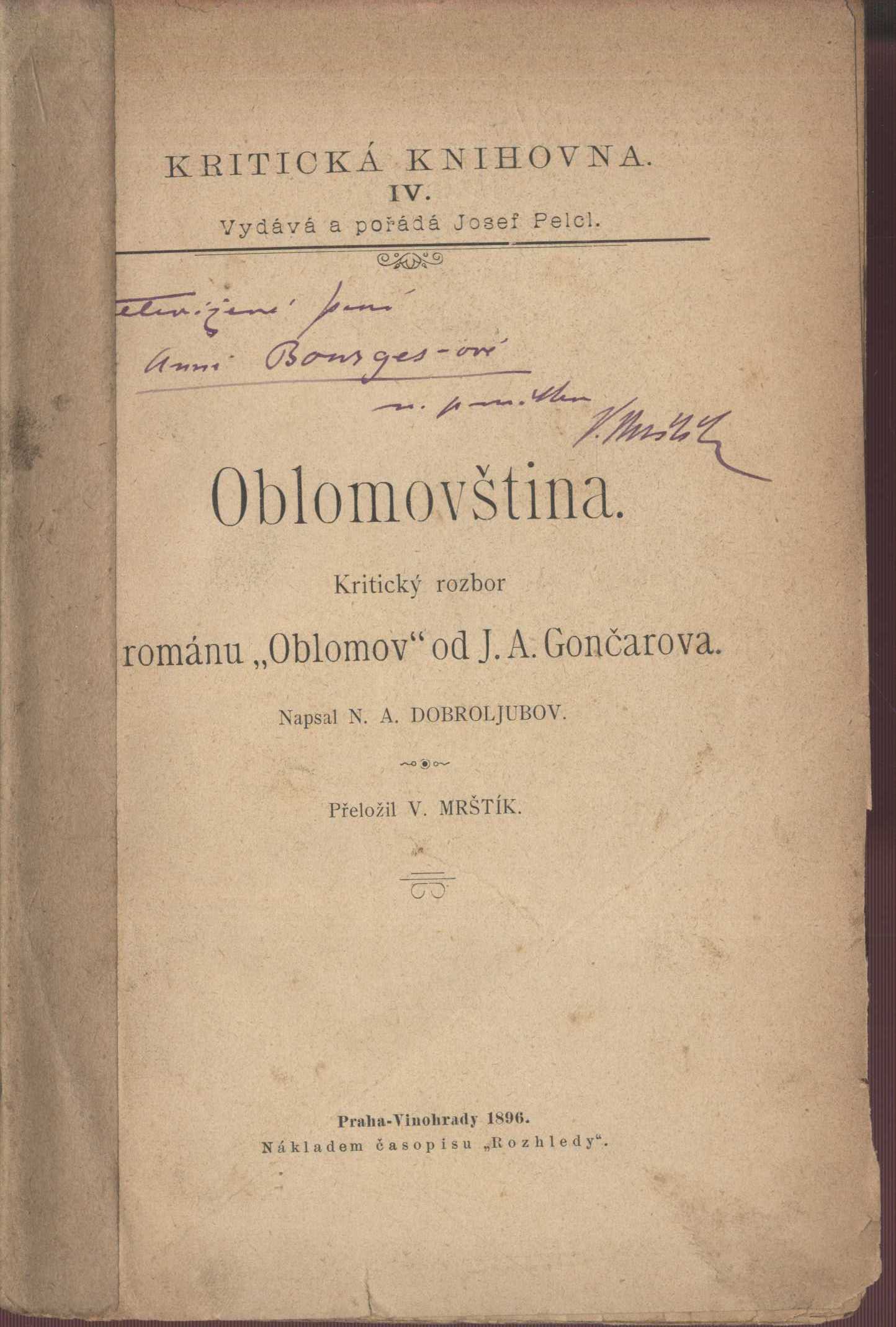 1. Názvové údajeOblomovština : kritický rozbor románu "Oblomov" od J. A. Gončarova / napsal N. A. Dobroljubov ; přeložil V. Mrštík