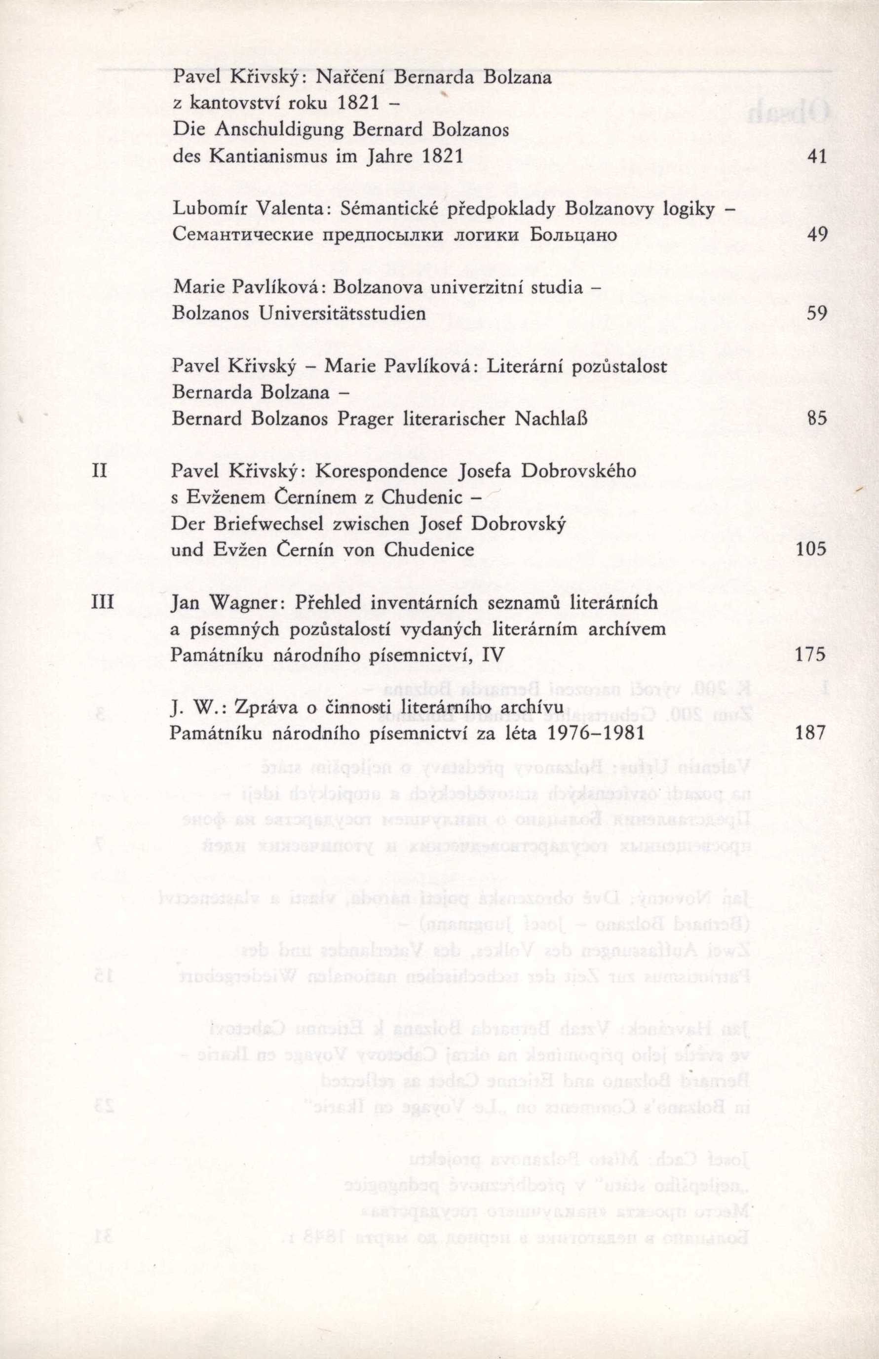 Názvové údaje Literární archív : sborník Památníku národního písemnictví = sbornik Muzeja češskoj pis'mennosti = Jahrbuch des Museums des tschechischen Schrifttums = annual of the Museum of the Czech Literature = Mémoires du Musée de la Littérature Tchèque. K 200. výročí narození Bernarda Bolzana / odpovědný redaktor Lubomír Vaculík ; grafická úprava a technická redakce Václav Jedlička Další autoři Vaculík, Lubomír, 1926-2006 (Editor) Jedlička, Václav 1931- (Knižní grafik) Korp. Památník národního písemnictví (muzeum literatury) (Nakladatel, vydavatel) Stráž, tiskařské závody (Tiskař) Roč., číslo 16, 1985 Další var.názvy K 200. výročí narození Bernarda Bolzana Údaje o vydání Vydání první Nakladatel Praha : Památník národního písemnictví, 1985 Výrobce Vimperk : Stráž, tiskařské závody, n. p., Plzeň Rozsah 195 stran ; 24 cm ISBN (Vázáno) Země vyd. Česko Jazyk dok. čeština * němčina Poznámky Text částečně německy. - Obsahuje bibliografické odkazy. - Cizojazyčná resumé. - Zpráva o činnosti literárního archivu PNP za léta 1976-1981 na str. 187-195.
