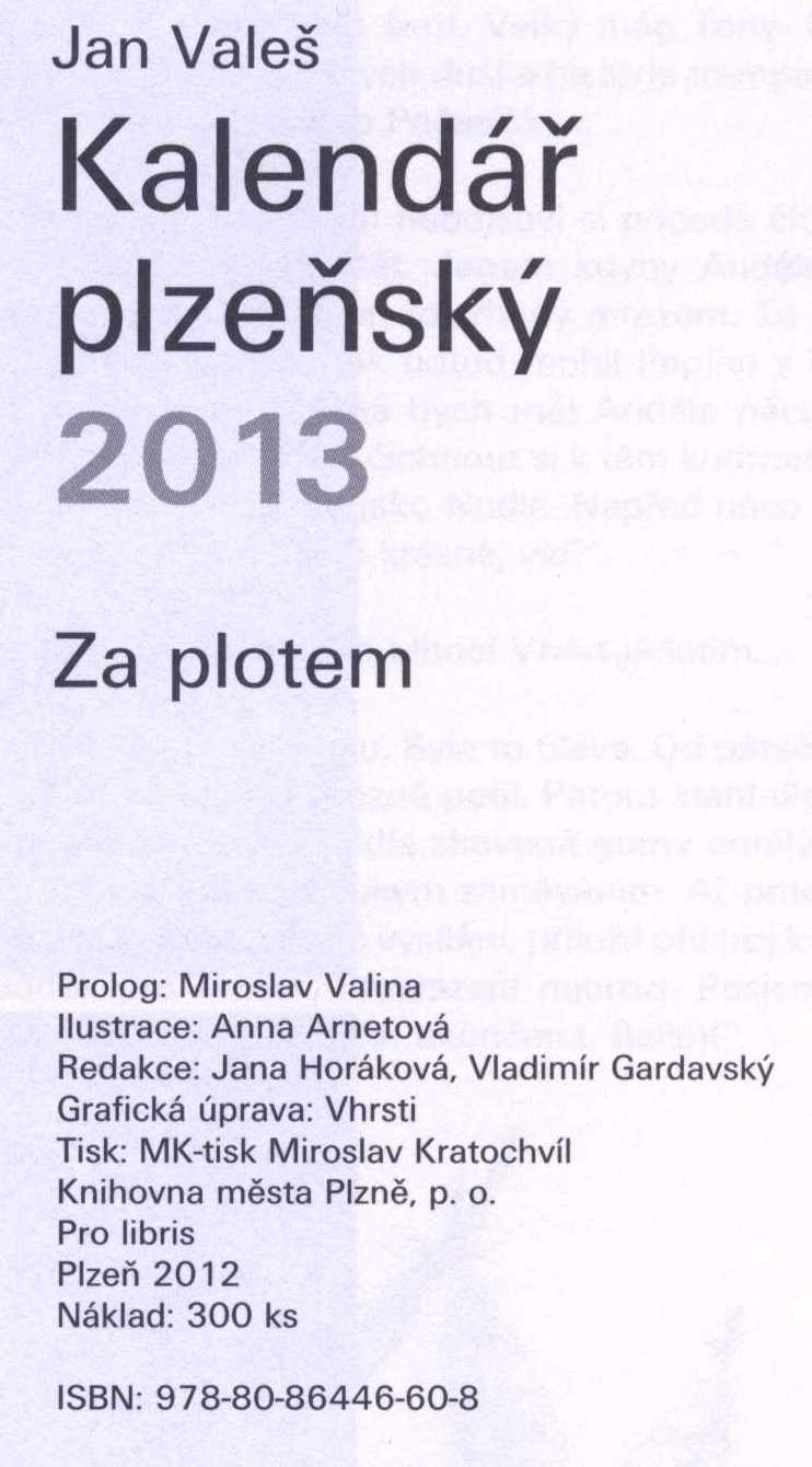 Title information Kalendář plzeňský 2013 : kratochvilné čtení na každý měsíc. Za plotem / Jan Valeš Personal name Valeš, Jan (Author) Další autoři Valina, Mirek, 1963- (Author of introduction) Štěpán Arnetová, Anna, 1980- (Illustrator) Corporation Knihovna města Plzně (Publisher) Pro libris (občanské sdružení, Plzeň) (Publisher) Roč., číslo 2013 Další var.názvy Za plotem Publication Plzeň : Knihovna města Plzně : Pro libris, 2012 Scope 47 stran : ilustrace ; 21 cm ISBN 978-80-86446-60-8 (brožováno) Country Czech Republic Language Czech Note Frontispis. - Čb. ilustrace v textu. - 300 výtisků