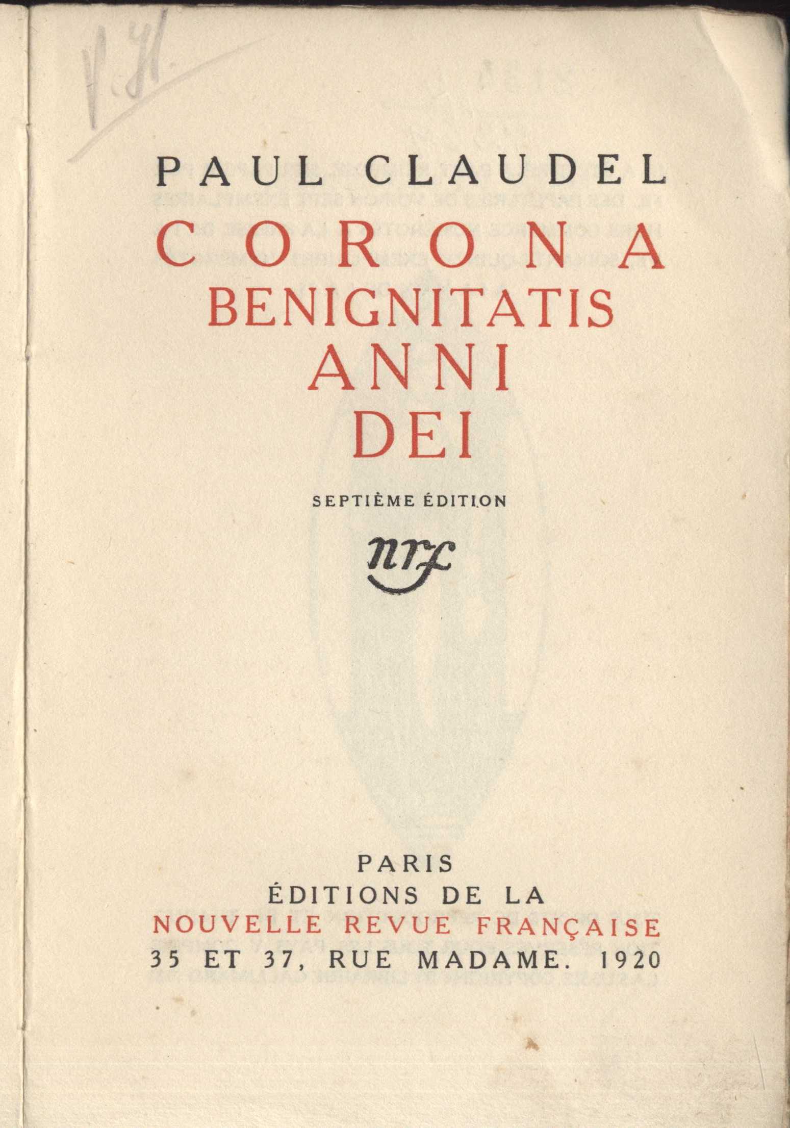 Názvové údaje Corona benignitatis ; Anni dei / Paul Claudel Osobní jméno Claudel, Paul, 1868-1955 (Dedikátor) (Autor) Další autoři Braunerová, Zdenka, 1858-1934 (Dedikant) (Dřívější majitel) Korp. Éditions de la Nouvelle Revue Française (Nakladatel, vydavatel) St. Catherine Press Ltd. (tiskárna, Belgie) (Tiskař) Údaje o vydání 7e édition Nakladatel Paris : Éditions de la Nouvelle Revue Française, 1920 Výrobce Imprimerie Sainte-Catherine) Rozsah 240 s. ISBN brož. Země vyd. Francie Jazyk dok. francouzština Poznámky Červeně a černě tištěná obálka zdobená trojitým rámcem. - Informace o dalších dílech autora. - Červený a černý tisk titulního listu. - V rámci nákladu vyšlo sedm výtisků mimo prodej na papíře "pur fil" z papíren Voiron tiskem číslovaných I-VII a sedmdesát čtyři ručně číslovaných 1-74.