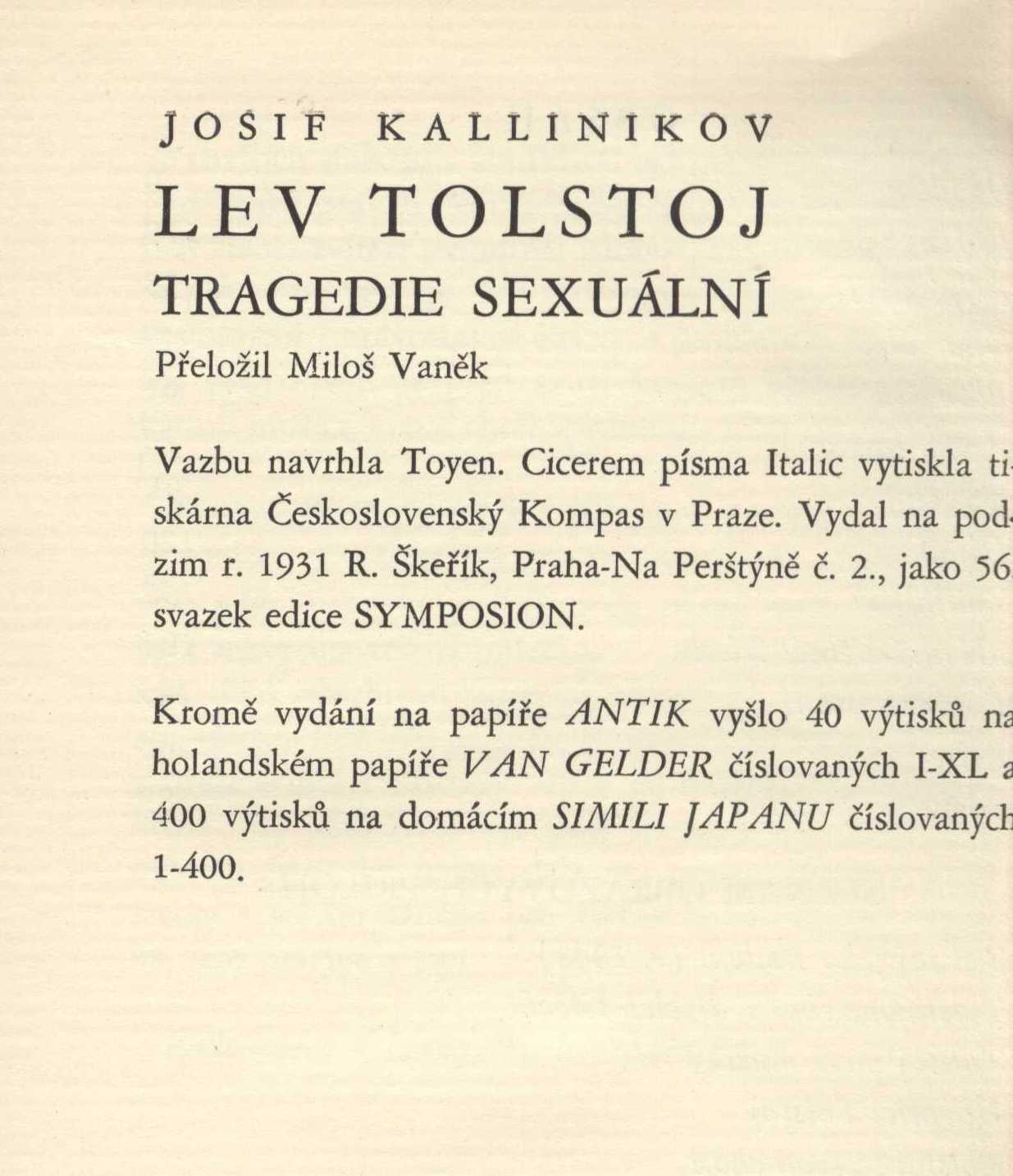 1. Názvové údajeLev Tolstoj : tragedie sexuální / Josif Kallinikov ; [přeložil Miloš Vaněk ; vazbu navrhla Toyen]