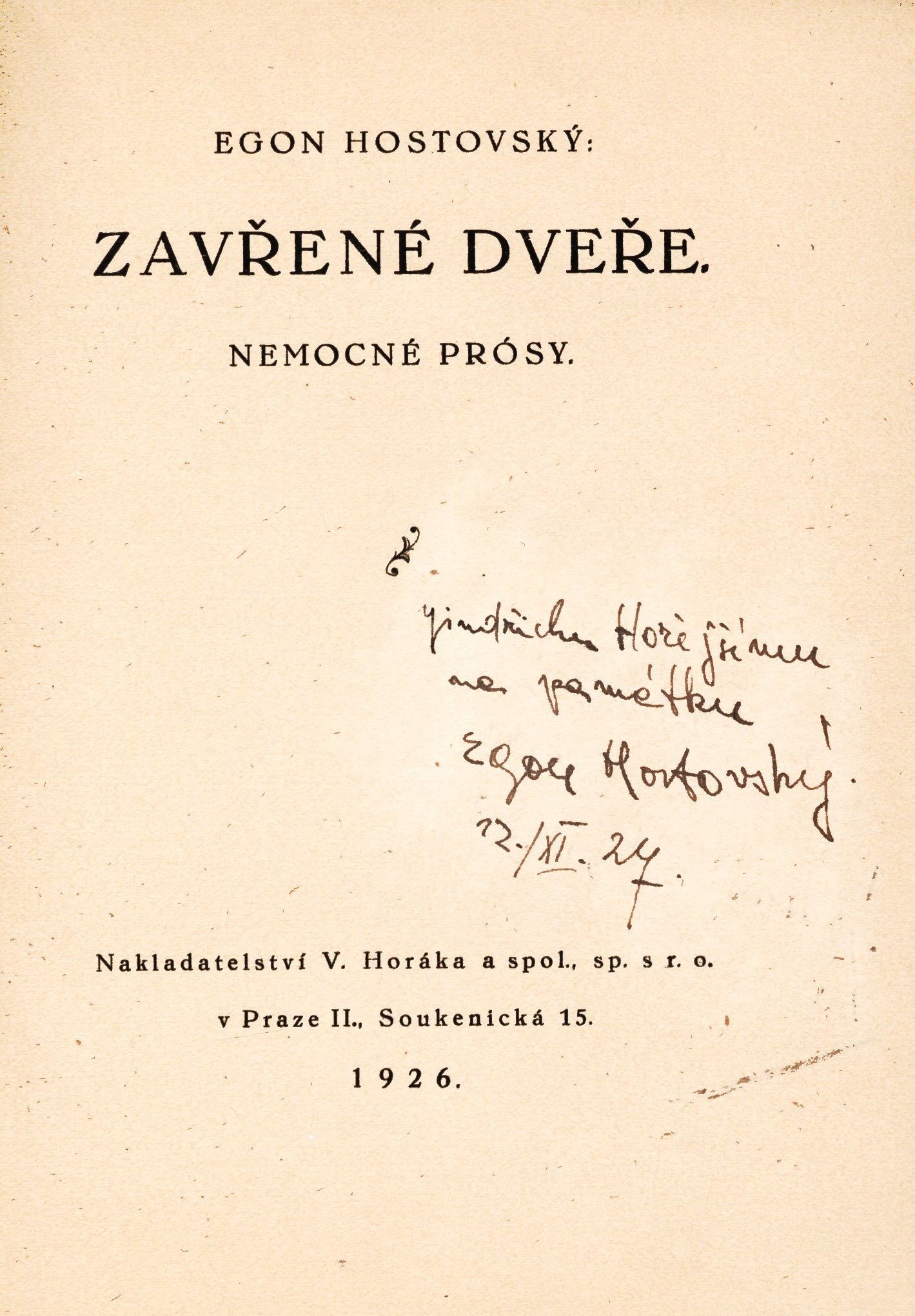 Názvové údaje Zavřené dveře : nemocné prósy / Egon Hostovský Osobní jméno Hostovský, Egon, 1908-1973 (Autor) (Dedikátor) Další autoři Martínek, Vojtěch, 1887-1960 (Dedikant) Hořejší, Jindřich, 1886-1941 (Dedikant) Korp. V. Horák a spol. (Praha) (Nakladatel, vydavatel) (Tiskař) Nakladatel V Praze : Nakladatelství V. Horáka a spol., 1926 Výrobce vlastním nákladem Rozsah 67 stran ; 18 cm ISBN (brožováno) Země vyd. Česko Jazyk dok. čeština Poznámky Ilustrovaná dvoubarevná obálka. - Černobílý titulní list. - Obsah. - Tiráž.