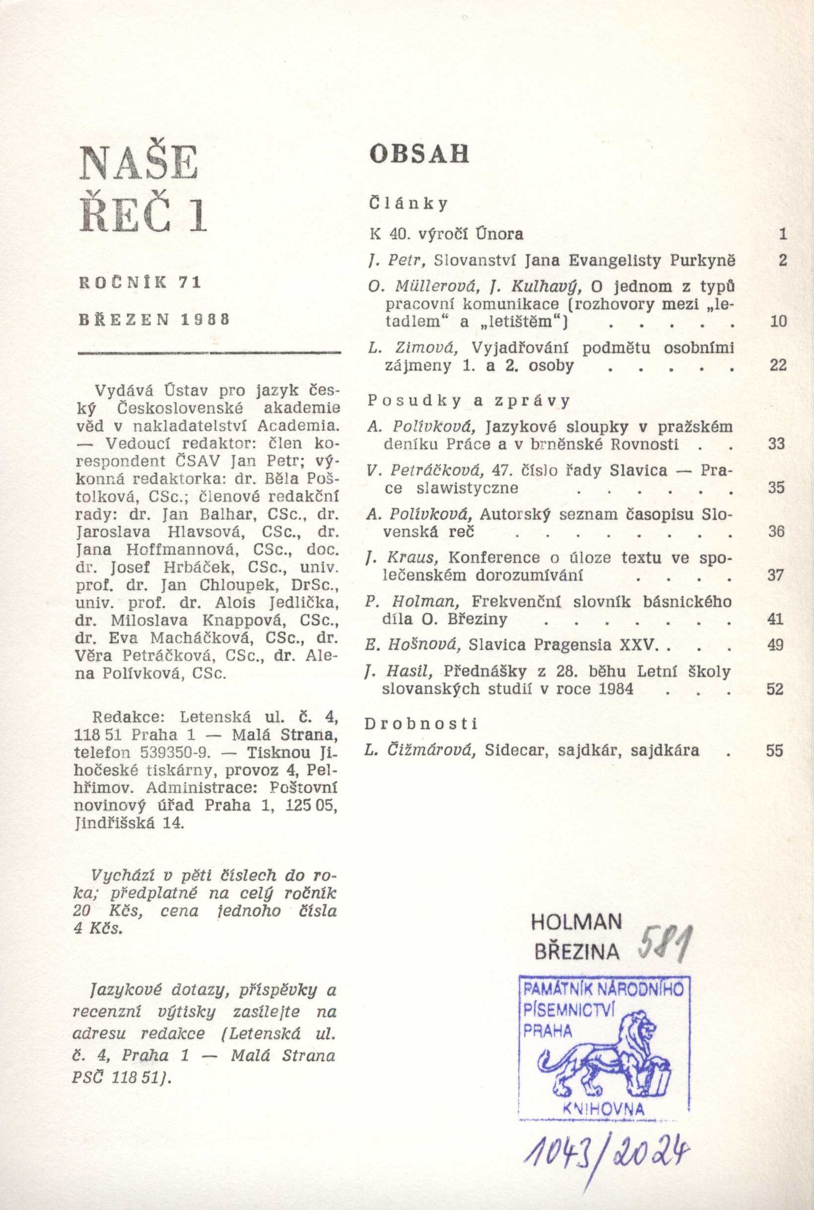 Poznámka o dalších původcích Vedoucí redaktor Jan Petr. - Výkonná redaktorka Běla Poštolková Druh dok. PERIODIKA - Svázaný ročník periodika Periodicita 5x ročně Poznámky o skryté bibliografii a rejstřících Obsahuje bibliografické odkazy a rejstříky. Nadřízená jednotka Naše řeč Klíčová slova český jazyk * jazyková kultura * lingvistika * gramatika * slovní zásoba * r. 1988 * odborný časopis MDT 811.162.3 * (042.5) * 8 * 81`36 Uživatelské pole PNP Sign. Q6 B29: černá poloplátěná vazba, zlacený hřbetní název; kompletní ročník včetně obálek Sign. Holman-Březina 581: Knihovna Petra Holmana. - Pouze č. 1. - Na s. 41-49 článek Petra Holmana "Frekvenční slovník básnického díla Otokara Březiny (K 120. výročí narození)". - Volně vložena sešitá xerokopie téhož Holmanova článku s rukopisnou dedikací Petra Holmana Dr. Václavu Durychovi s podpisem a datací.