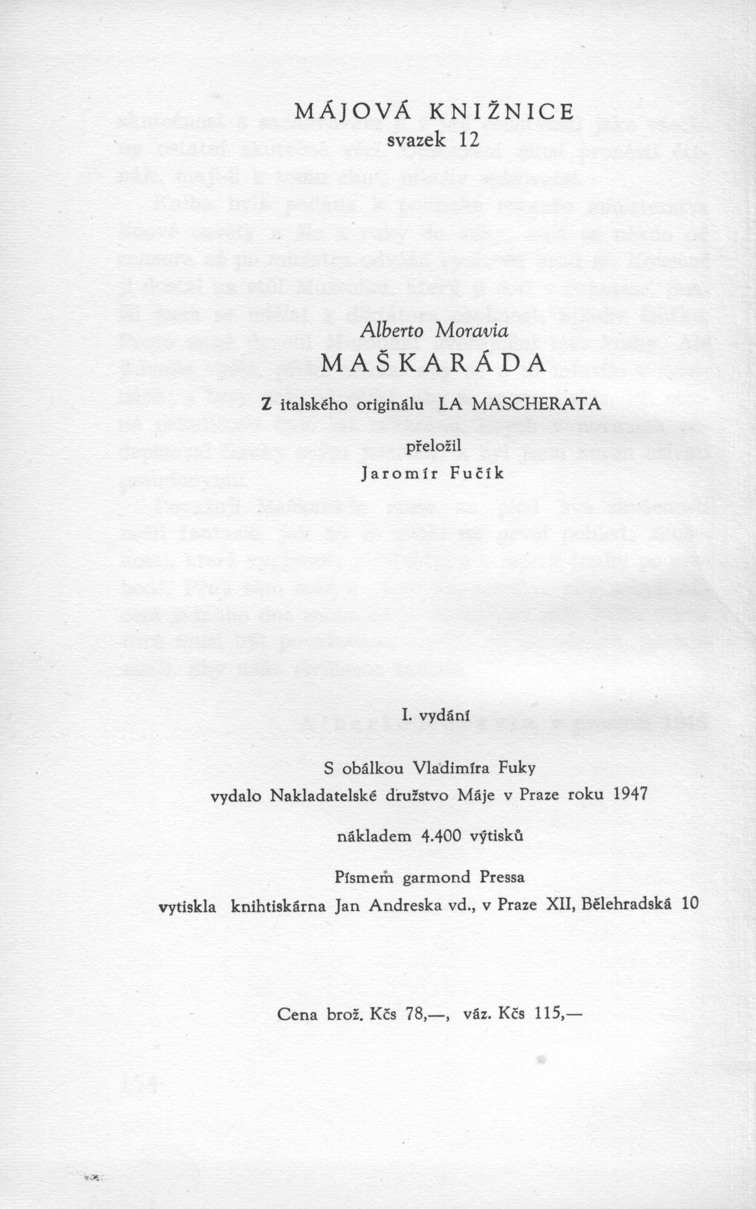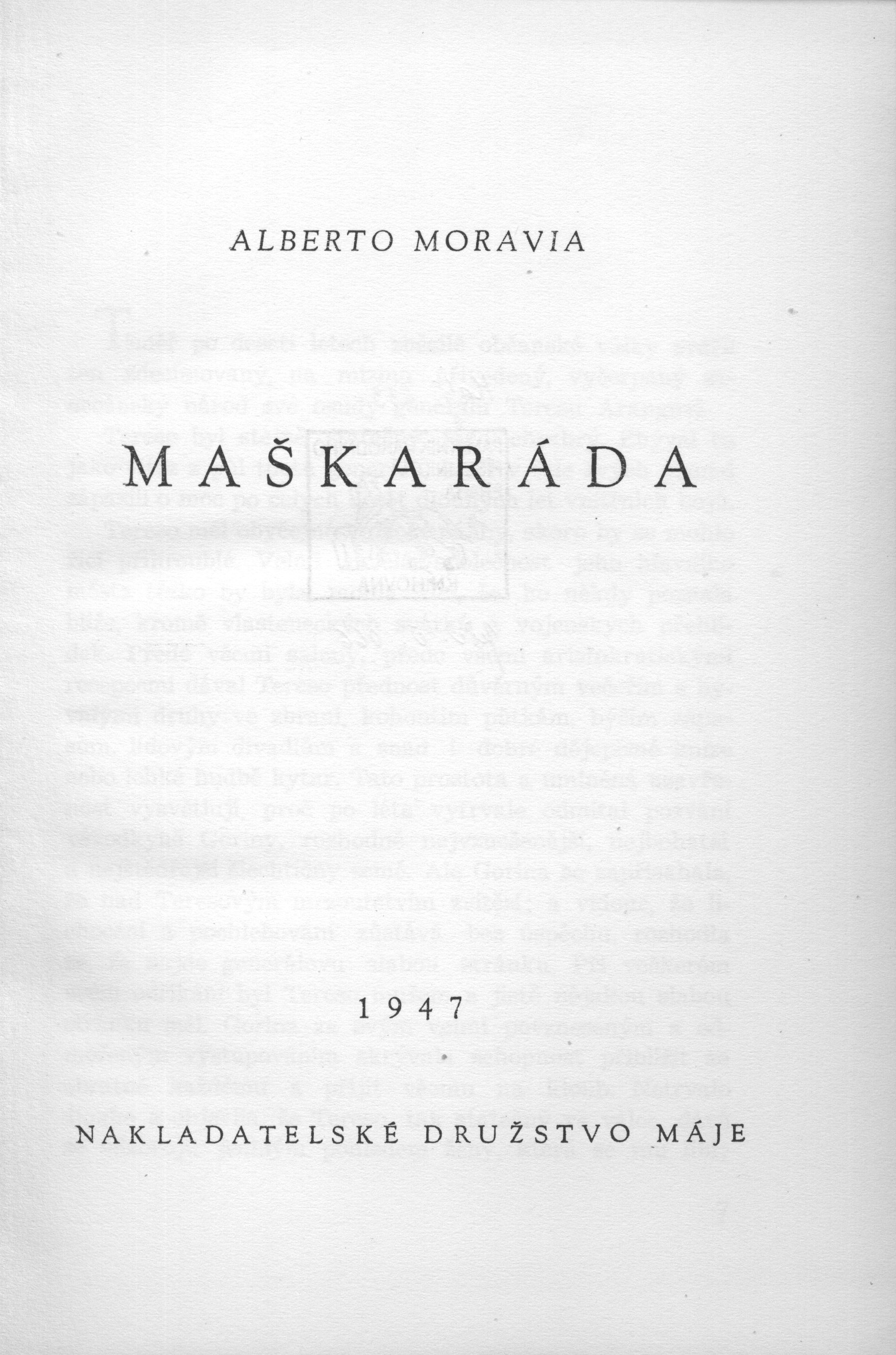 Druh dok. monografie Název originálu La Mascherata Klíčová slova italská literatura * próza * překlad * román * Itálie * fašismus MDT 821.131.1 * 82-3 * =030 * 82-31 * (450) * 329.18 Uživatelské pole PNP U sign. Máj 033 (vázaný výtisk) barevně ilustrovaná obálka (V. Fuka). - Na přední záložce upoutávka na knihu. – Poloplátěná vazba s jasně žlutým zdobeným papírovým polepem a barevnou ražbou; oranžový hřbet s hnědým textem. – Na přední předsádce razítko Archiv Čs. spisovatel, č. P 519. - Nakladatelská značka. - Patitul. - Titulní list. - Doslov autora. - Edice nad tiráží. – Na zadní záložce upoutávka na jiný titul. - Na zadní straně obálky opakující se nakladatelská značka a ceny. Tiráž: "Májová knižnice svazek 12. Alberto Moravia. Maškaráda. Z italského originálu La Mascherata přeložil Jaromír Fučík. I. vydání. S obálkou Vladimíra Fuky vydalo Nakladatelské družstvo Máje v Praze roku 1947 nákladem 4.400 výtisků.Písmem garmond Pressa vytiskla knihtiskárna Jan Andreska vd., v Praze XII, Bělehradská 10. Cena brož. Kčs 78.-, váz. Kčs 115,-" Rozsah: 154, [2] s. Rozměr: 20,9 cm Originál La Mascherata vyšel v roce 1941. Signatura Přír.číslo Lokace Info Máj 033 1827/2013 Sbírka