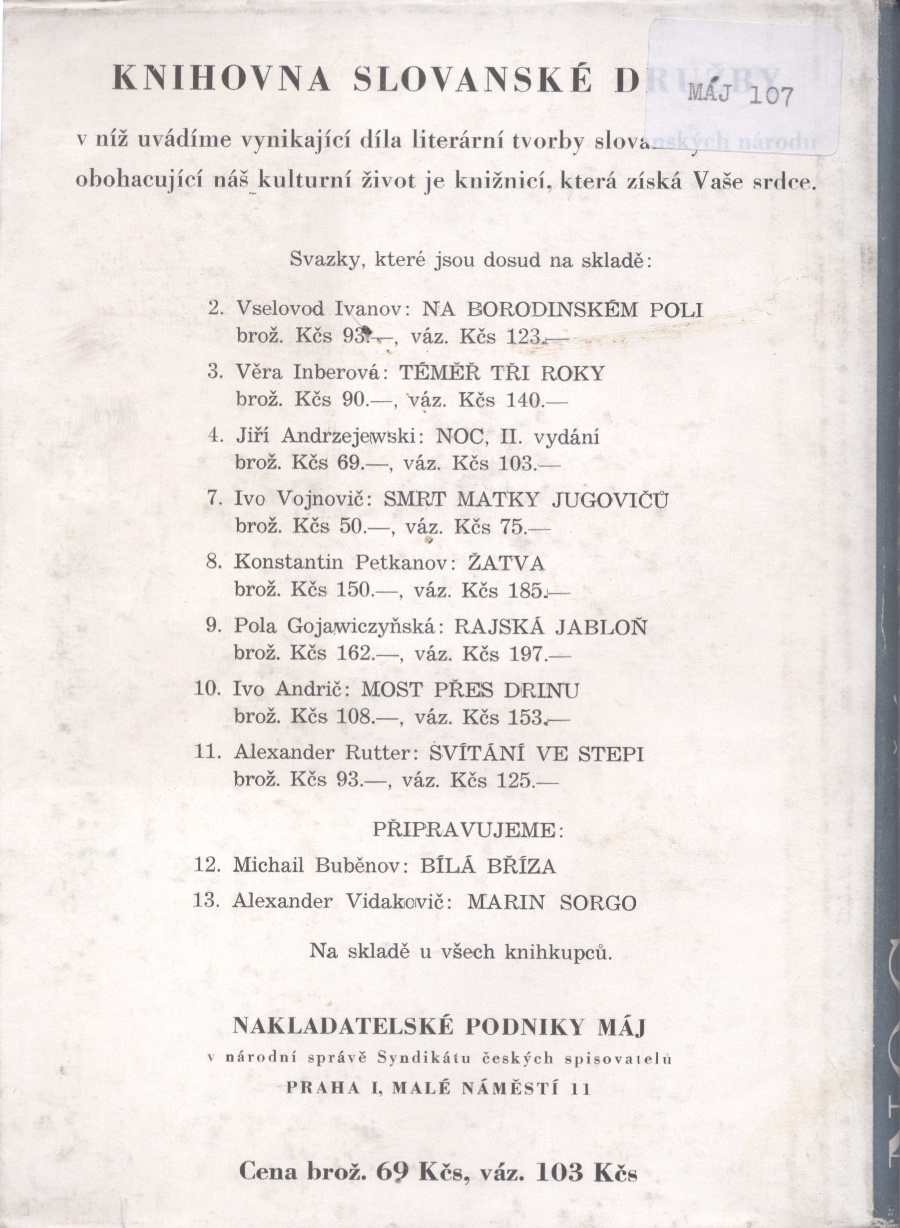 Knihovna slovanské družby, (Nakladatelské družstvo Máje)Země vyd. Česko Jazyk dok. čeština Jazyk orig. polština Poznámky Zdobená obálka. - Na záložkách foto autora a upoutávka na knihu. - Zdobená vazba. - Nakladatelská značka. - Dvoubarevný titulní list. - Obsah. - Tiráž s edicí. - Na zadní straně obálky ediční upoutávka.