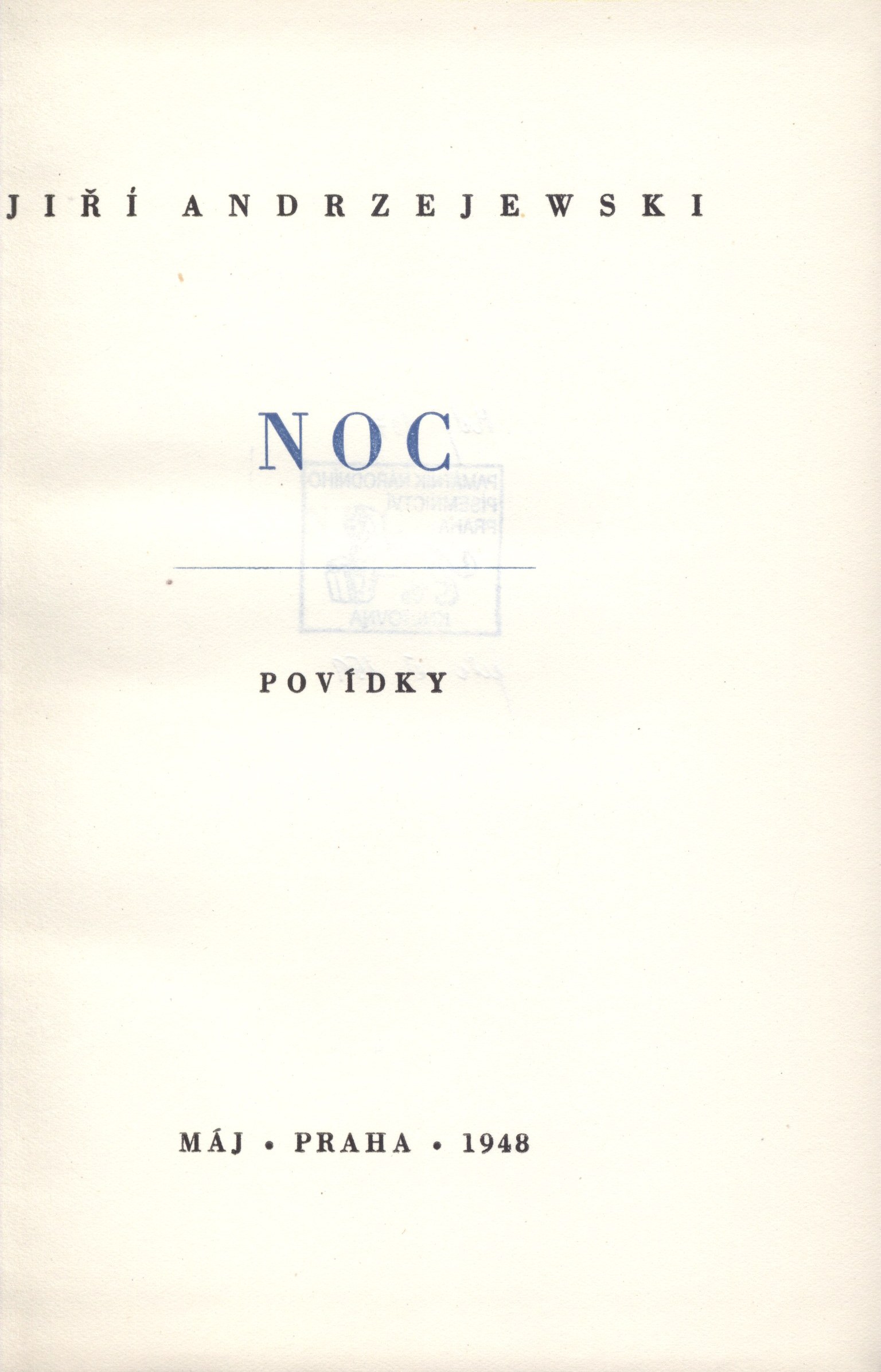 Druh dok. monografie Název originálu Noć Klíčová slova polská literatura * překlad * próza * povídky * Polsko * 2. světová válka MDT 821.162.1 * =030 * (438) * 94(100)"1939/1945" * 82-3 * 82-32 Uživatelské pole PNP U sign. Máj 107 (vázaný výtisk) obálka s ilustrací (J. Říha). - Na záložkách upoutávka na knihu, na přední foto autora. - Poloplátěná typizovaná vazba edice; hřbet šedomodrý s modrou ražbou textu. - Na přední předsádce razítko Archiv Čs. spisovatel, č. P 544.- Nakladatelská značka. - Dvoubarevný titulní list. - Obsah. - Tiráž s edicí. - Na zadní straně obálky ediční upoutávka a uvedeny ceny. Tiráž: "Knihovna slovanské družby svazek 4. Jiří Andrzejewski. Noc. II. vydání. Z polského originálu Noć přeložila Helena Teigová. S obálkou Josefa Říhy vydal Máj v Praze r. 1948 nákladem 5500 výtisků. Písmem Candida vytiskla tiskárna Cíl v Rumburku. Cena brož. Kčs 69.-, váz. Kčs 103." Rozsah: 209, [3] s. Rozměr: 20,8 cm Originál Noć vyšel v roce 1945. Signatura Přír.číslo Lokace Info Máj 107 2544/2013 Sbírka