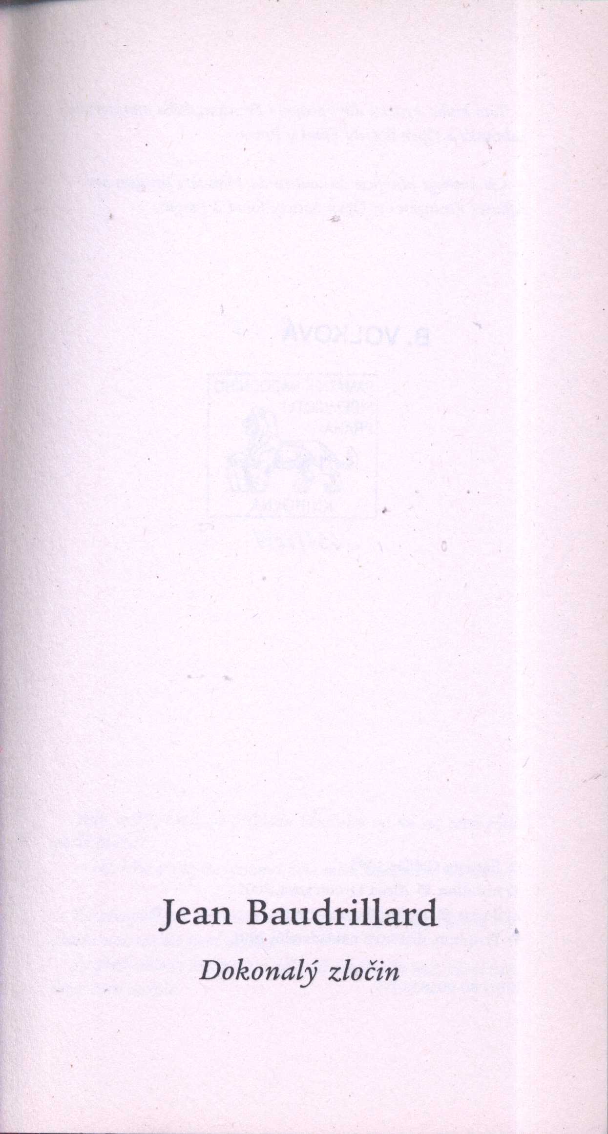 1. Názvové údajeDokonalý zločin / Jean Baudrillard ; [z francouzského originálu ... přeložila Alena Dvořáčková ; doslov Radim Brázda ; typofrafie Jan Světlík]