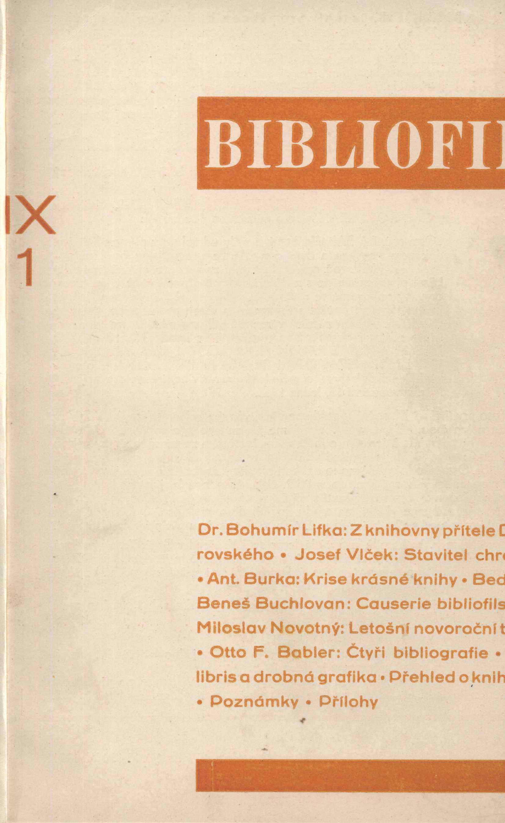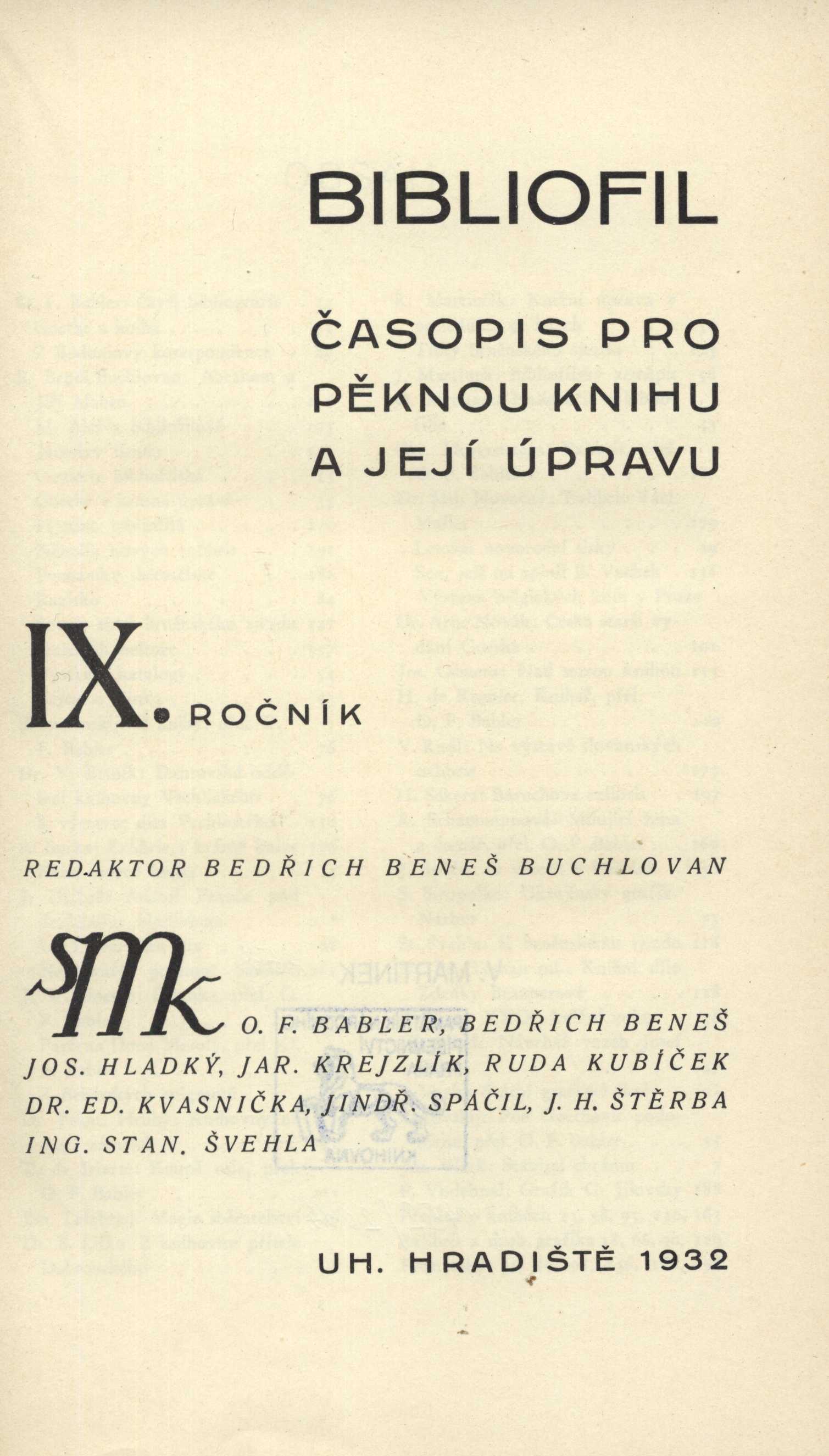 Názvové údaje Bibliofil : časopis pro pěknou knihu a její úpravu Další autoři Beneš Buchlovan, Bedřich, 1885-1953 (Editor) Korp. Pokorný a spol. (Brno) (prt (Brno)) Skupina moravských knihomilů (Nakladatel, vydavatel) Roč., číslo ročník 9, číslo 1-10, 1932 Nakladatel Uherské Hradiště : Skupina moravských knihomilů, 1932 Výrobce Pokorný a spol.) Rozsah [22] obr. příl., [34] il. 231 s. Země vyd. Česko Jazyk dok. čeština Poznámky Na frontispisu Novoročenka Jaroslava Švába (dvoubarevný dřevoryt). - Černobílé, tónované i barevné ilustrace na přílohách i v textu. - Jednotlivá čísla obsahují obrazové přílohy, u některých ročníků jsou přivázány na konci svazku. - Seznam vyobrazení v textu a na přílohách. - Občasné nakladatelské inzerce. - Bibliografické informace