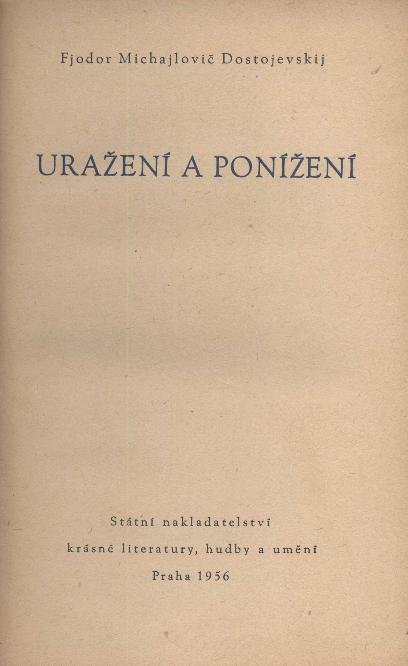 Názvové údaje Uražení a ponížení / Fjodor Michajlovič Dostojevskij ; z ruského originálu přeložil Bohumil Mathesius Osobní jméno Dostojevskij, Fedor Michajlovič, 1821-1881 (Autor) Další autoři Mathesius, Bohumil, 1888-1952 (Překladatel) Moisejenková, Ervína (Autor komentáře) (Editor) Dolanský, Julius, 1903-1975 (Autor doslovu, tiráže atd.) Tichý, František, 1896-1961 (Ilustrátor) (Autor obálky) (Výtvarník vazby) Korp. Státní nakladatelství krásné literatury, hudby a umění (Nakladatel, vydavatel) Ostravské tiskárny (Český Těšín) (Tiskař) (Tiskař obrazu) Údaje o vydání Vydání deváté, (v SNKL prvé) Nakladatel Praha : Státní nakladatelství krásné literatury, hudby a umění, 1956 Výrobce Český Těšín : Ostravské tiskárny, n. p., provozovna 08 Rozsah 401 stran, 1 nečíslovaný list obrazové přílohy : ilustrace ; 21 cm ISBN (Vázáno) Země vyd. Česko Jazyk dok. čeština Jazyk orig. ruština Poznámky Upravila a vysvětlivkami opatřila Ervína Moisejenková