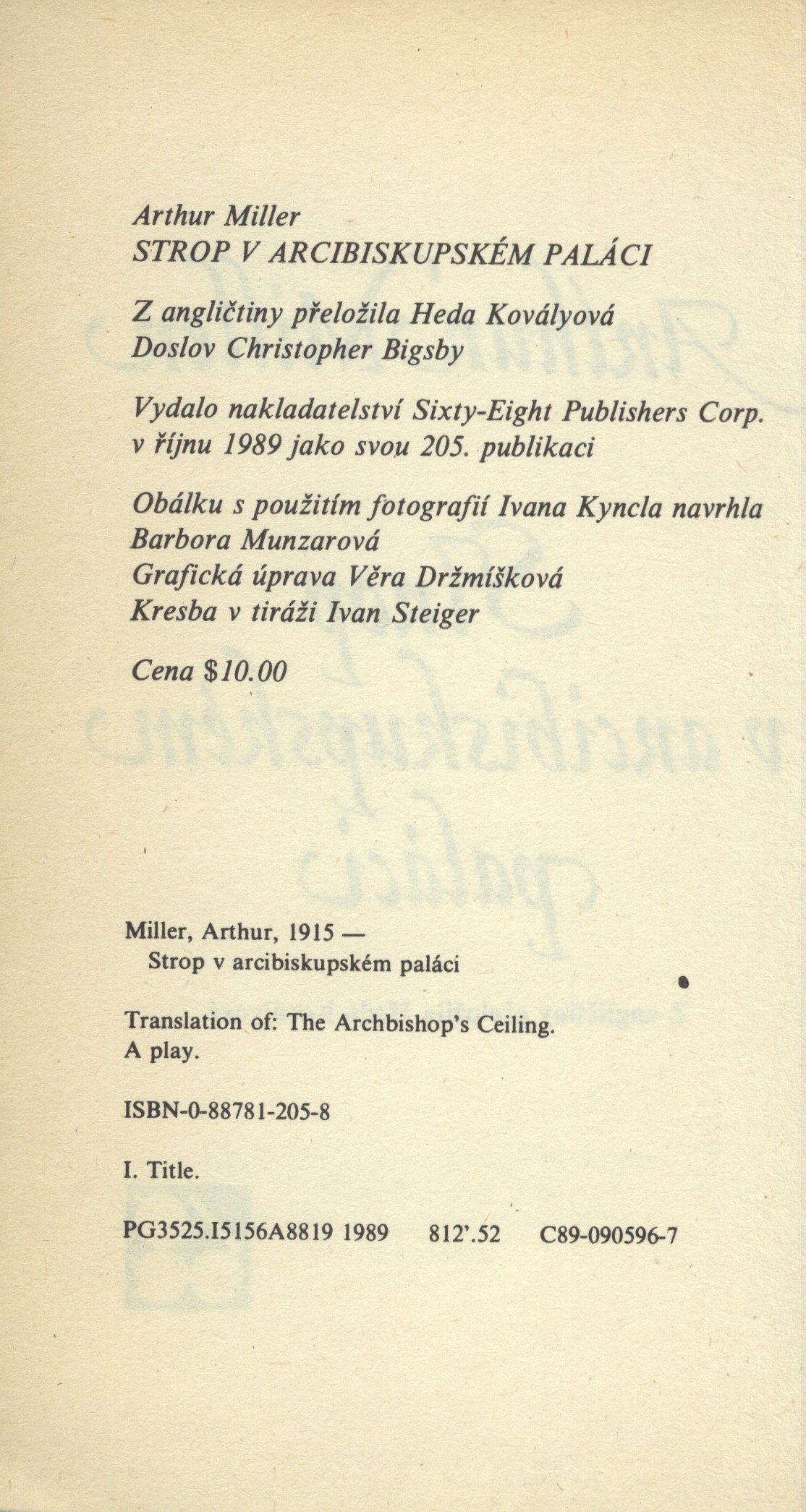 Druh dok. monografie Osobní hesla Miller, Arthur, 1915-2005 - americký dramatik a esejista Klíčová slova americká literatura * překlad * drama * divadelní hra * Československo Žánr/forma americká dramata Konspekt Americké drama MDT 821.111(73) * =030 * 82-2 * (437) * 821.111(73)-2 Uživatelské pole PNP U sign. Topič osobní knihovna Topiče a Milady Blekastad. U sign. Topič 0257 (brožovaný výtisk) fotoobálka (B. Munzarová, foto I. Kyncl). - Značka (I. Steiger) u vydavatele. - Titulní list s nakladatelskou značkou, na rubu nakladatelské údaje. - Doslov (Ch. Bigsby). - Vakát. - Na zadní straně obálky foto (I. Kyncl). U sign. Topič 0257 zachovalý výtisk. Rozsah: 102, [2] s. Rozměr: 17,8 cm Originál The Archbishop's Ceiling vyšel v roce 1977. Signatura Přír.číslo Lokace Info Topič 0257 1784/2014 Sbírka