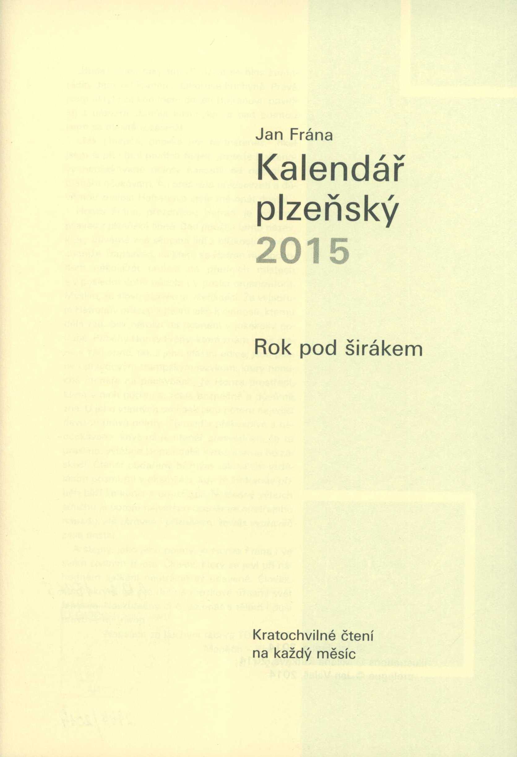 1. Názvové údajeKalendář plzeňský 2015 : kratochvilné čtení na každý měsíc. Rok pod širákem / Jan Frána