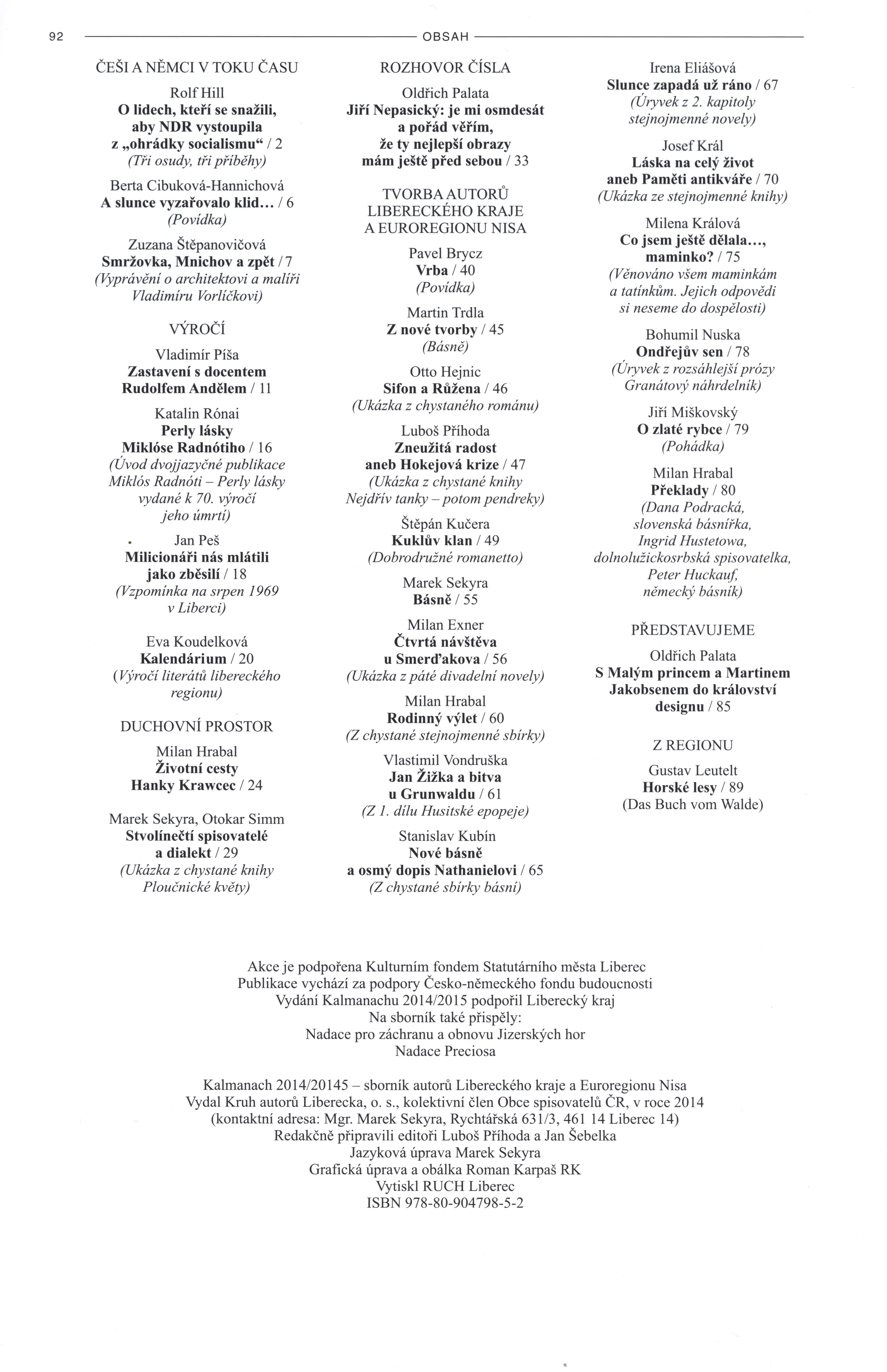 1. Názvové údajeKalmanach 2014/2015 : Kruh autorů Liberecka / [redakčně připravili editoři Luboš Příhoda a Jan Šebelka ; grafická úprava a obálka Roman Karpaš RK]