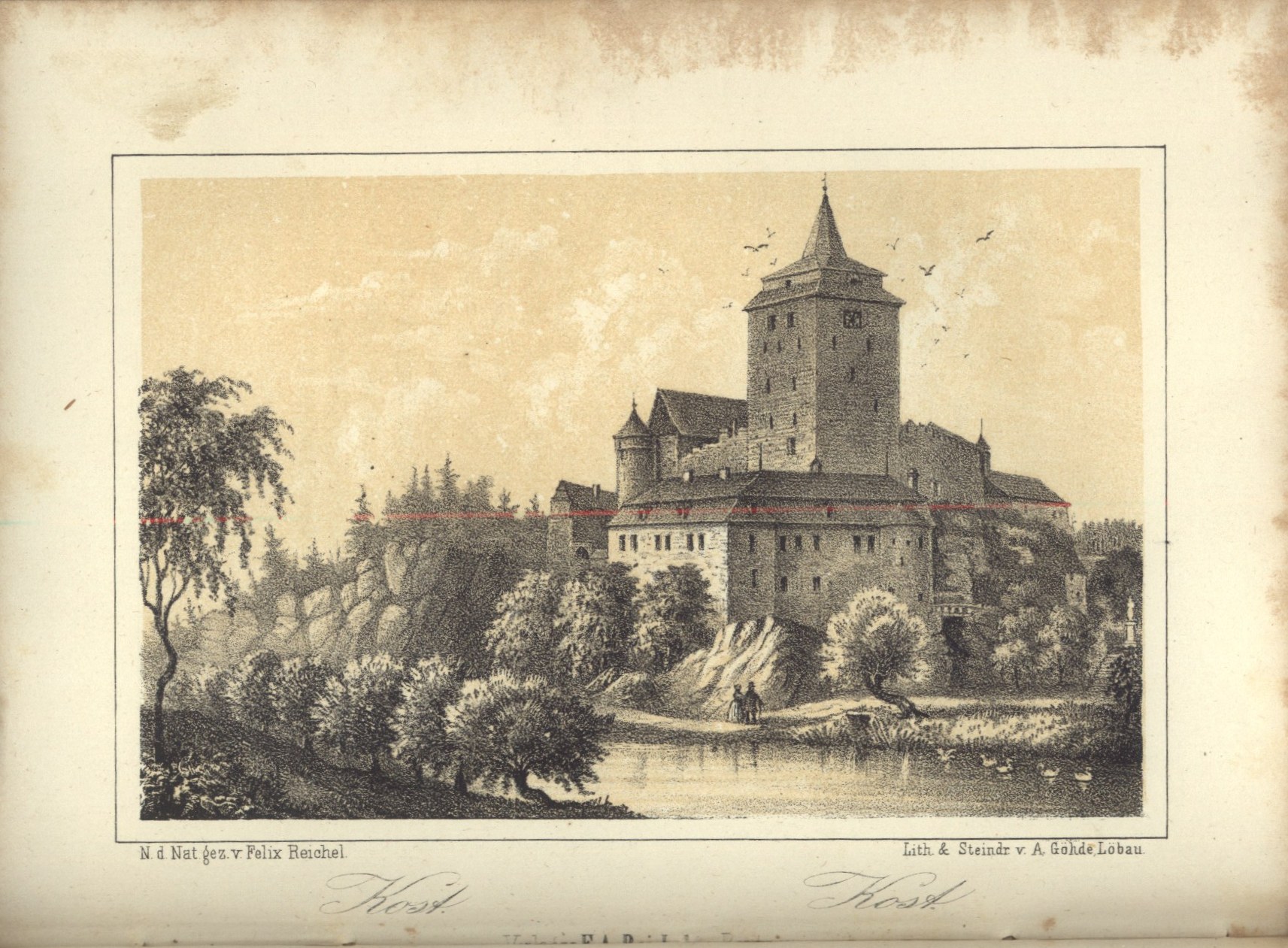 9 litografických příloh, některé s barevným pozadím, zhotovených většinou Adolfem Göhdem v Lobavě podle předloh Felixe Reichela a vydané firmou F.A. Reichel v Budyšíně, vesměs signovaných "N[ach]. d[er]. Nat[ur]. gez[ieret]. v[on]. Felix Reichel - Lith[ographie]. & Steindr[uck]. v[on]. A[dolph]. Göhde, Löbau - Verlag v[on]. F.A. Reichel in Bautzen" zobrazujících lázně Sedmihorky "Wartenberg Sedmyhorské lazne" (frontispis mezi s. [1]-I), zámek Hrubou Skálu "Gross Skal Hruba Skála" (bez údaje o litografu, barevné pozadí, mezi s. 90-91), hrad Valdštejn "Waldstein Waldstýn" (barevné pozadí, mezi s. 110-111), hrad Trosky "Ruine-Trosky Trosky" (N[ach]. ein Orig[ina]l Gemälde - Lith[ographie]. & Steindr[uck]. v[on]. A[dolph]. Göhde, Löbau - Verlag v[on]. F.A. Reichel in Bautzen", barevné pozadí, mezi s. 116-117), město Turnov "Turnau Turnov" (barevné pozadí, mezi s. 124-125), zámek Malá Skála "Klein Skal Malá Skála" (barevné pozadí, mezi s. 164-165),