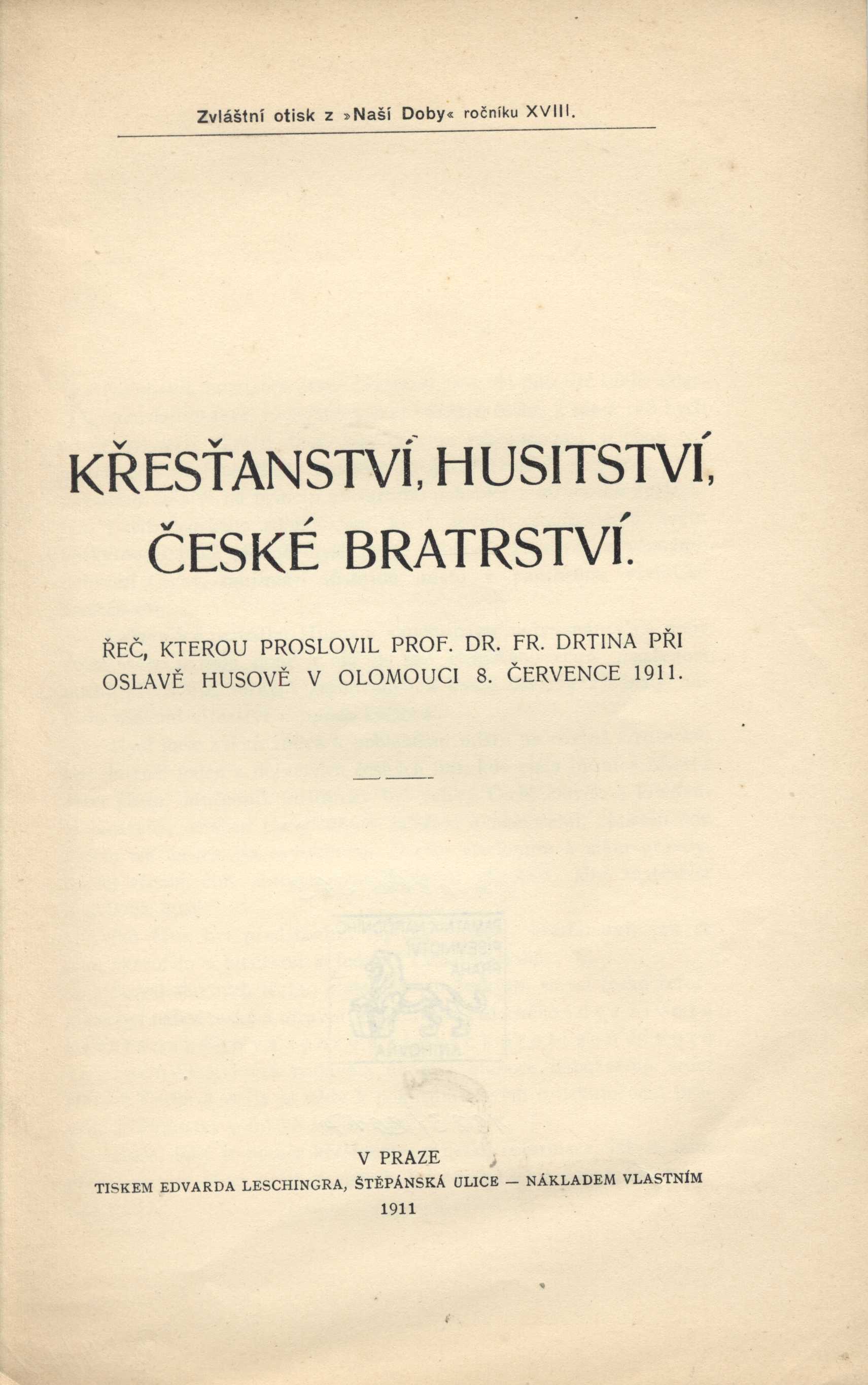 1. Názvové údajeKřesťanství, husitství, české bratrství / řeč, kterou proslovil prof. dr. Fr. Drtina při oslavě Husově v Olomouci 8. července 1911