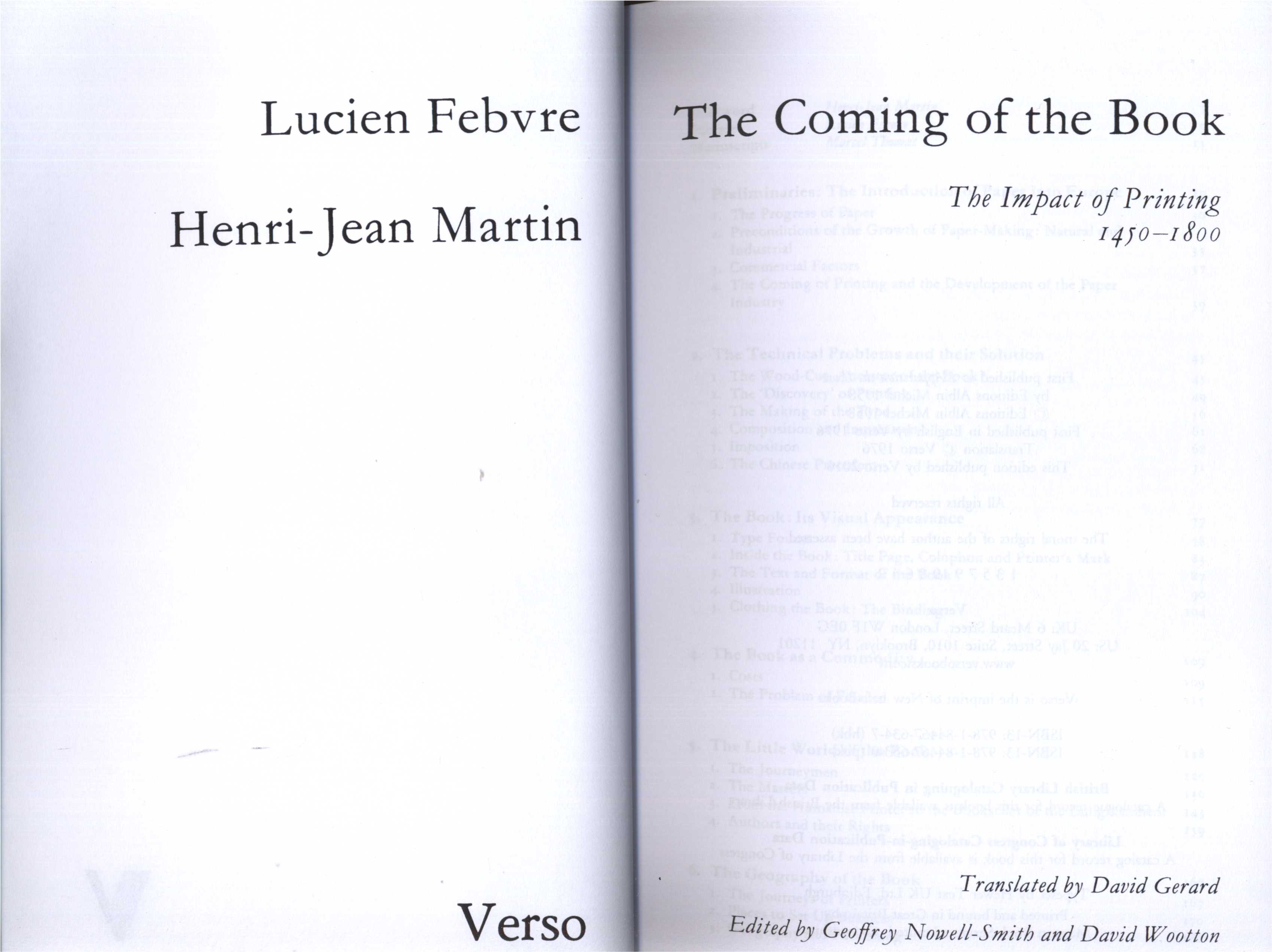 Názvové údaje The coming of the book : the impact of printing 1450-1800 / Lucien Febvre, Henri-Jean Martin ; translated [from the French] by David Gerard ; edited by Geoffrey Nowell-Smith and David Wootton Osobní jméno Febvre, Lucien, 1878-1956 (Autor) Další autoři Martin, Henri-Jean, 1924-2007 (Autor) Gerard, David, překladatel (Překladatel) Wootton, David, 1952- (Editor) Nowell-Smith, Geoffrey, 1939- (Editor) Nakladatel London : Verso, 2010 Rozsah 378 s. ISBN 978-1-84467-633-0 (brož.) Země vyd. Velká Británie Jazyk dok. angličtina Jazyk orig. francouzština Poznámky Zdobená obálka. - Rozložený titulní list . - Poznámky. - Rejstříky. - Vakáty. - Na zadní straně obálky informace o knize a autorech.